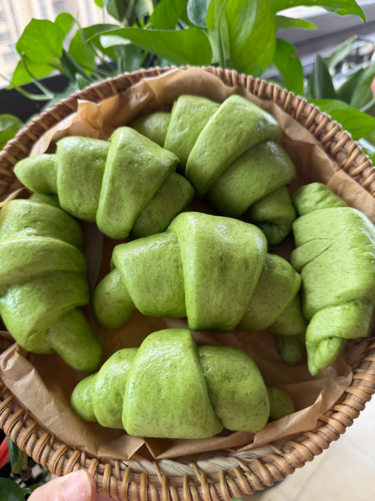🌱💚 风靡烘焙圈的「羽衣甘蓝牛角包馒头」终于开团! ——当法式慵懒遇上东方手作,每一口都是春日气息💨✨ ______ 🥐 颠覆传统认知的「羽衣甘蓝牛角包馒头」诞生! 牛角包的层次 ✖ 中式老面发酵的柔韧 ✖ 羽衣甘蓝天然翠绿 👉 8层折叠!麦香层层绽放🧈🌾 👉 新鲜羽衣甘蓝榨汁入面,天然叶绿素晕染翡翠纹理🍃💎 👉 每日现蒸!蓬松如云朵却暗藏酥脆灵魂☁️🔥 ______