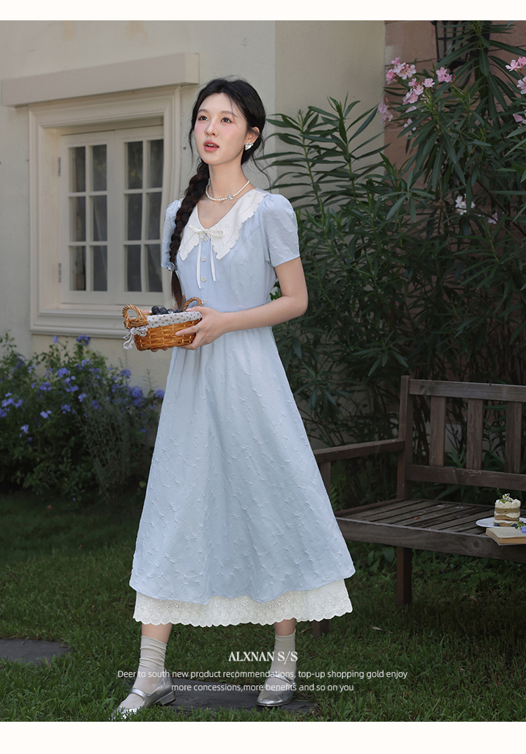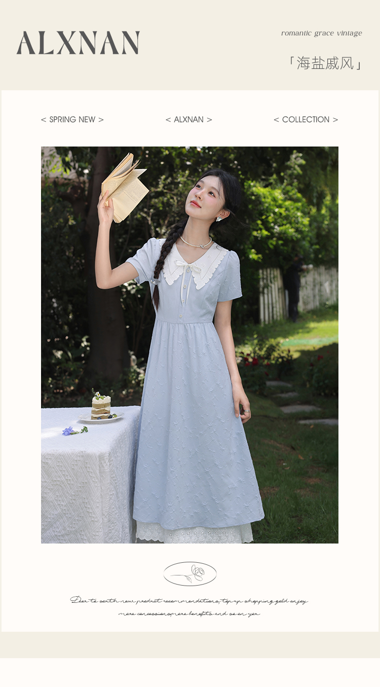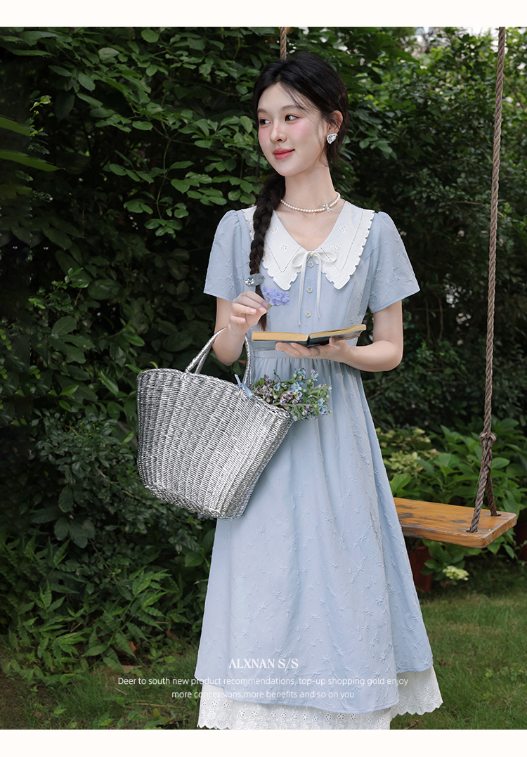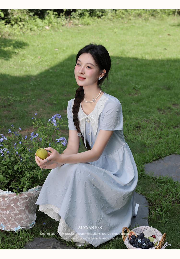 鹿向南「蓝纱缚雾」法式蓝色连衣裙女夏短袖巨好看的掐腰长款裙子