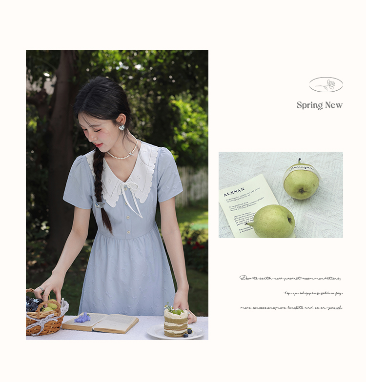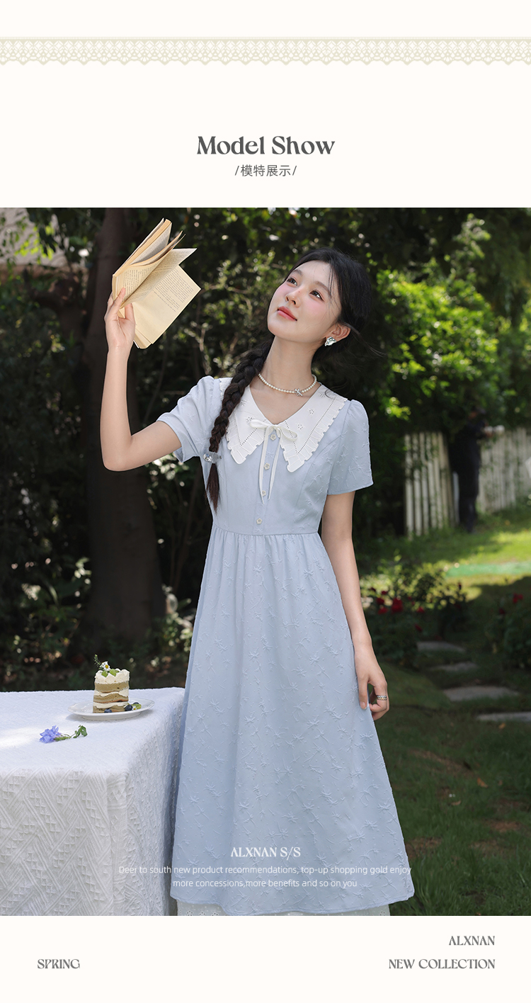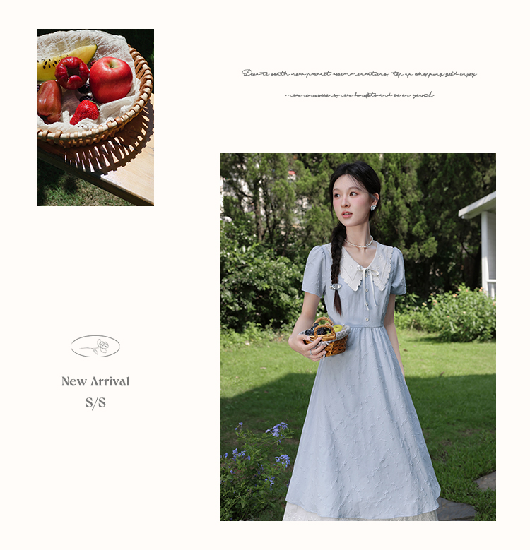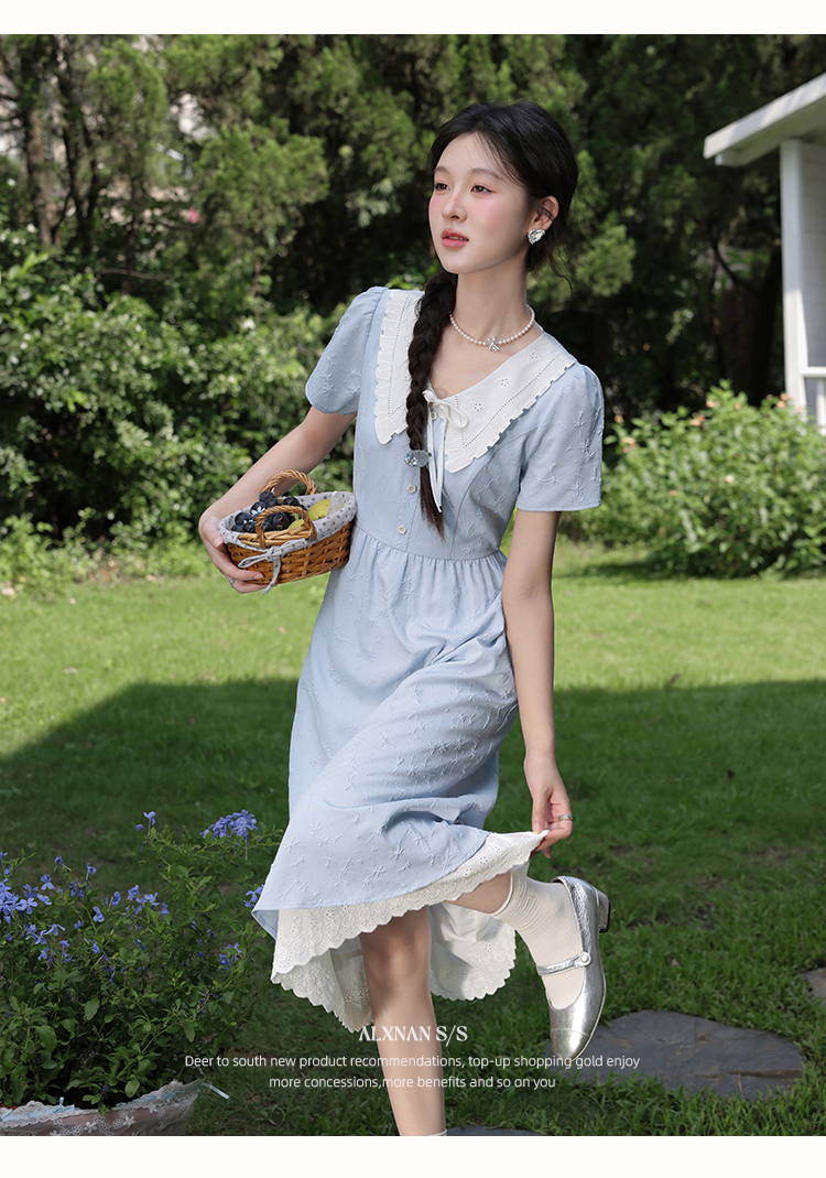 鹿向南「蓝纱缚雾」法式蓝色连衣裙女夏短袖巨好看的掐腰长款裙子