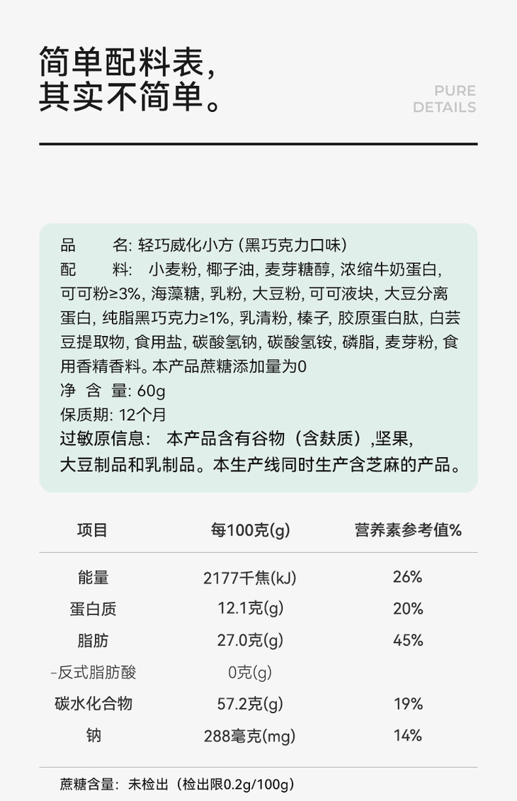 🟣威化小方——无蔗糖放肆吃 就将旧年的烦恼抛诸脑后,头也不回的往前走吧 在踏进家门的那一刻,让身体变轻松 就连空气中的浮尘都化作悦耳的音符🎶 在细腻丝滑的可可上旋转 伴着节奏踩在松脆的饼干上 酥脆的快感通过愉悦的脚步分享到脑海 饼皮经过了精心的烘焙,酥脆而均匀 一层威化一层夹心,满满的内馅🍫 夹心层还能拥有不一样的搭配可能性 每一口都能带来无尽的惊喜