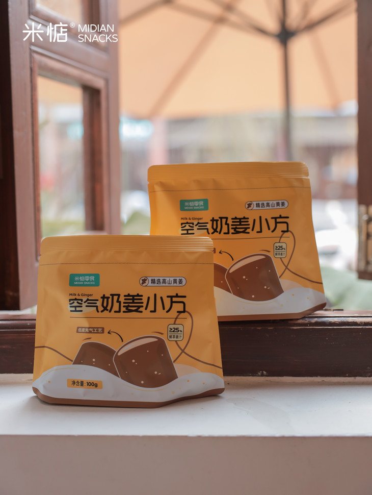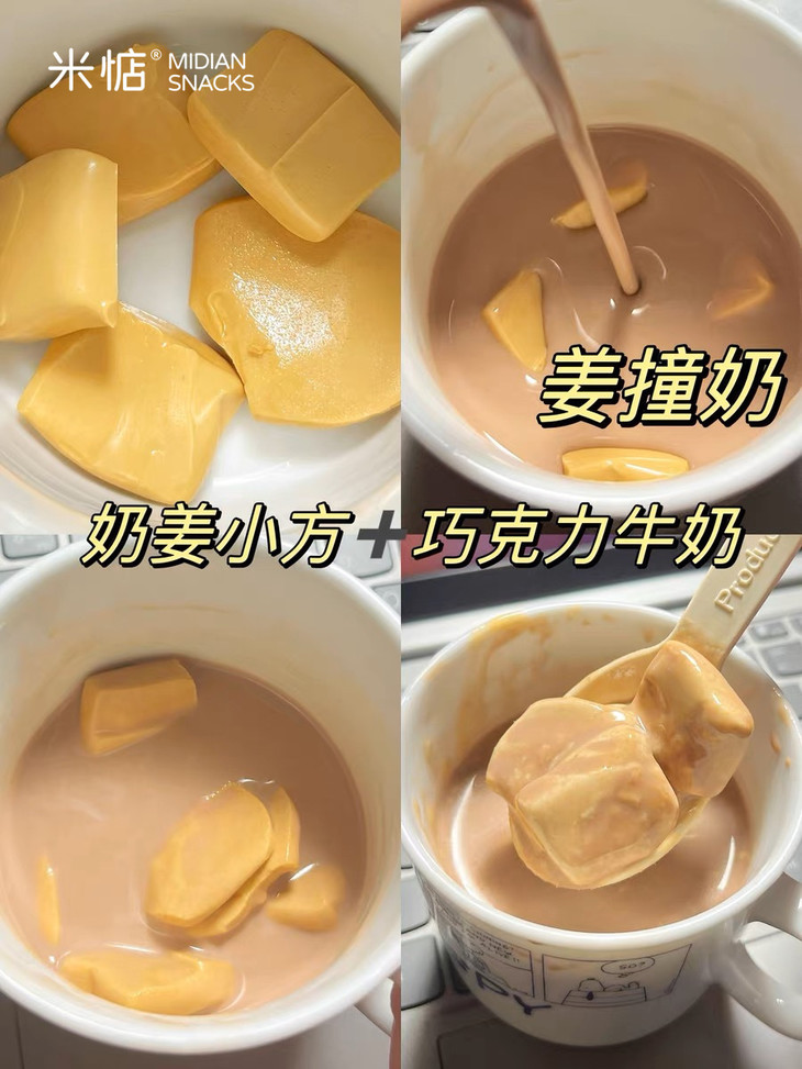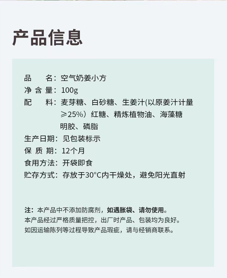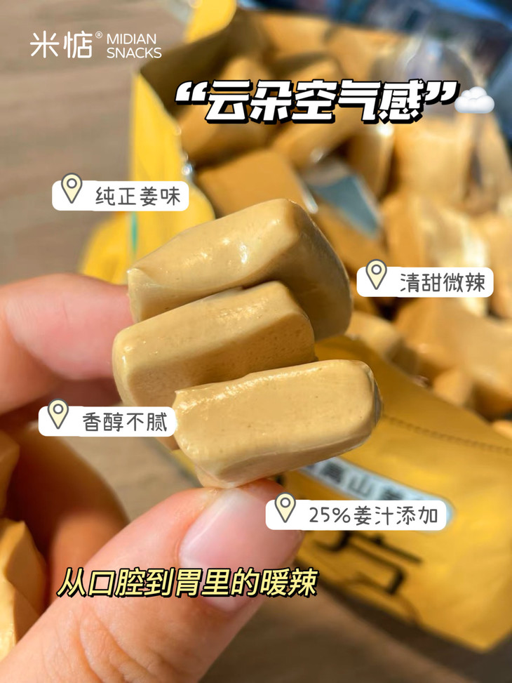 用成本较高的麦芽糖作为主原料搭配海藻糖 既能降低白糖的甜度也能让口感更佳健康丰富 这是拥有“云朵空气感”的小方糖🍬 添加≥25%的姜汁,入口有生姜的微辣 接着伴随着浓浓的奶味,好像在喝“姜撞奶”哇😋