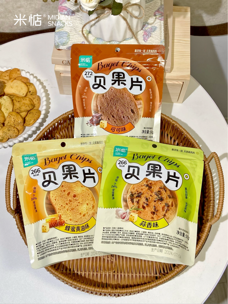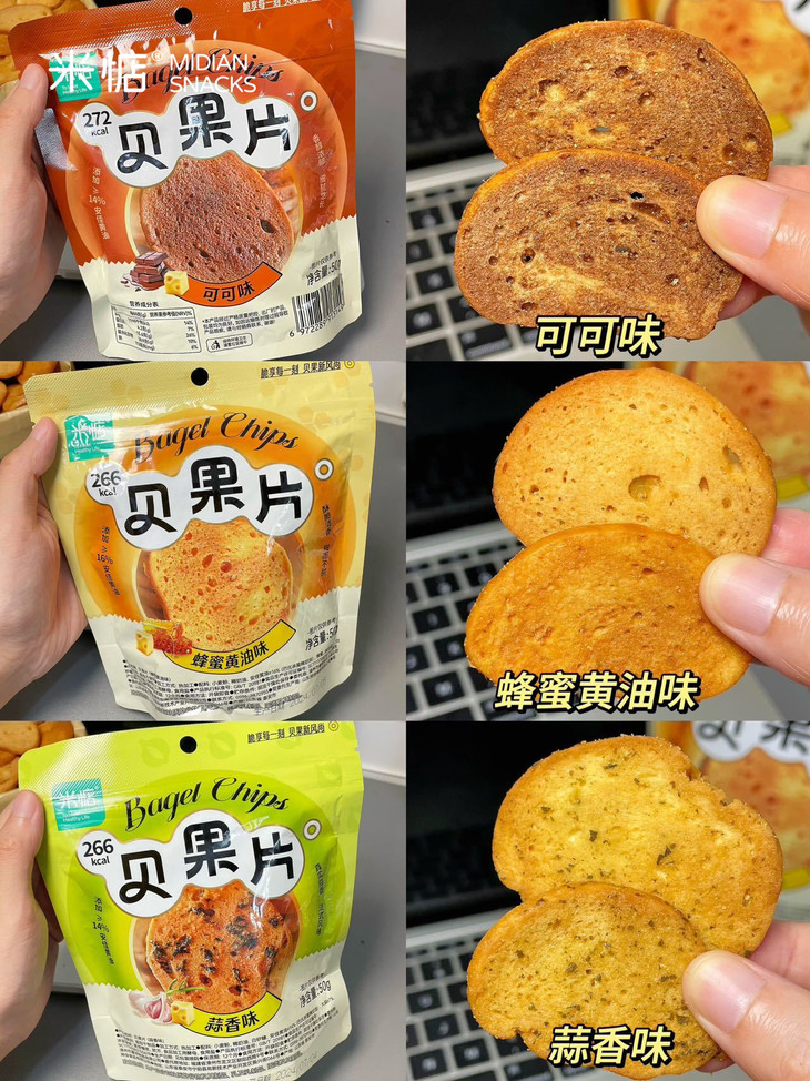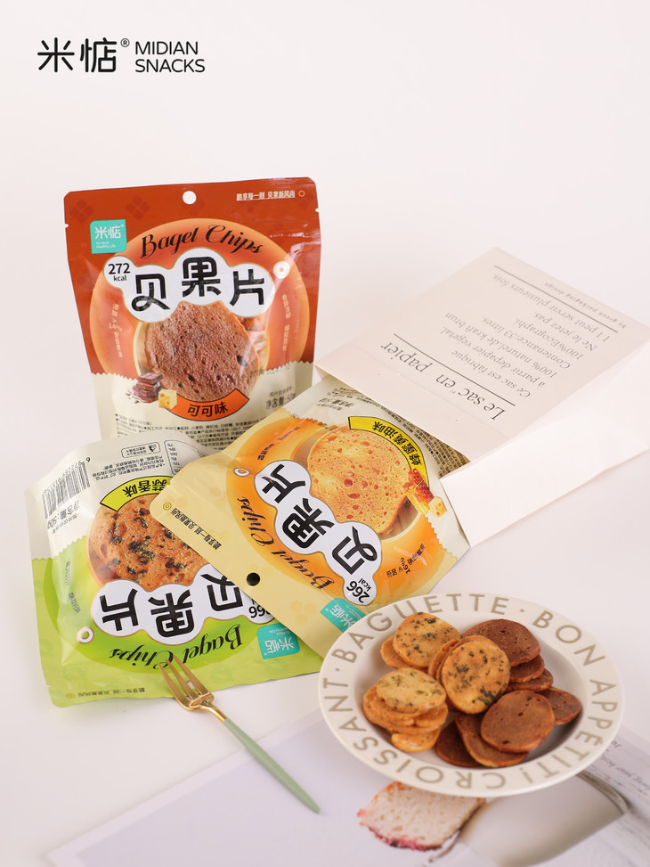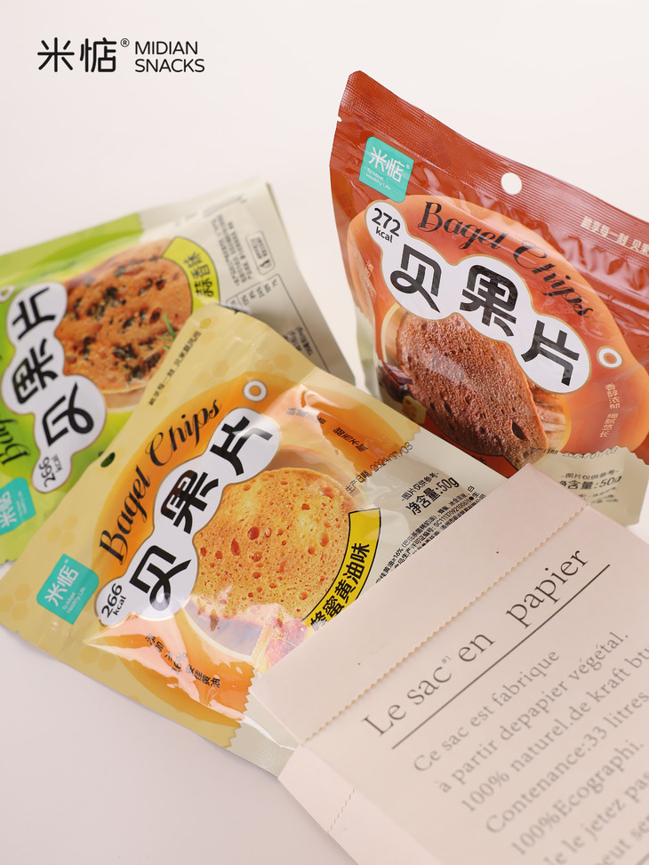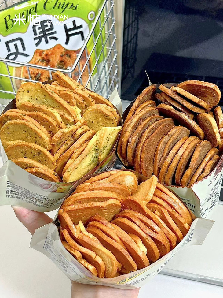🔺 三种口味随机不指定,任意也好吃 🔺 薄切贝果片,酥酥脆脆充满空气感 🔺 巴氏杀菌蛋液,食用更安全 🔺 选用安佳动物黄油 🔺 非油炸非膨化,好吃不上火 🔺看的见的干净配料