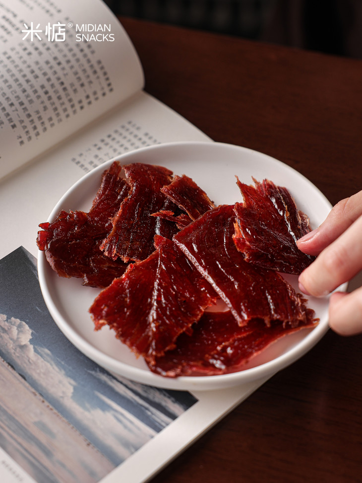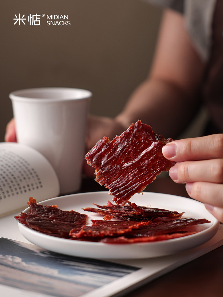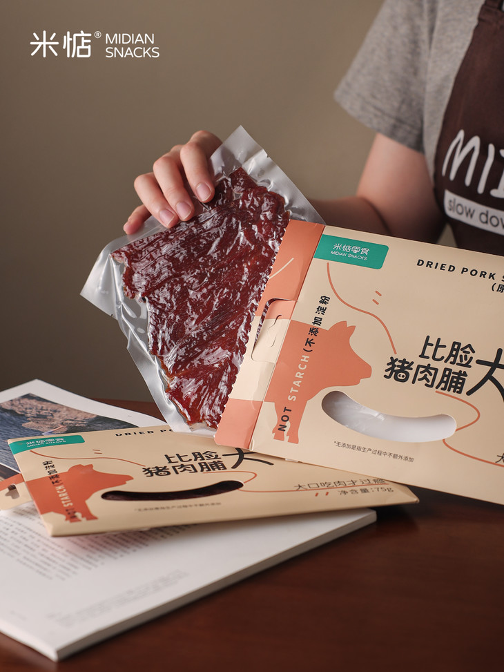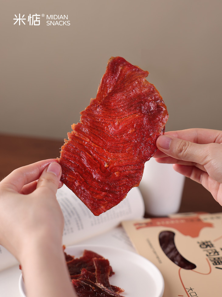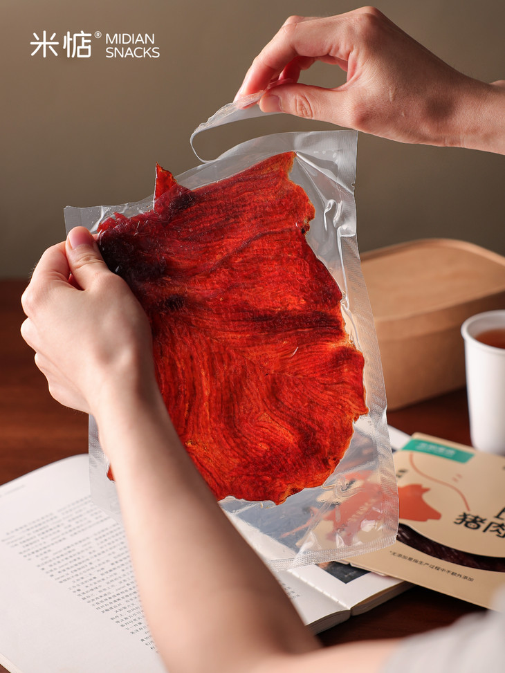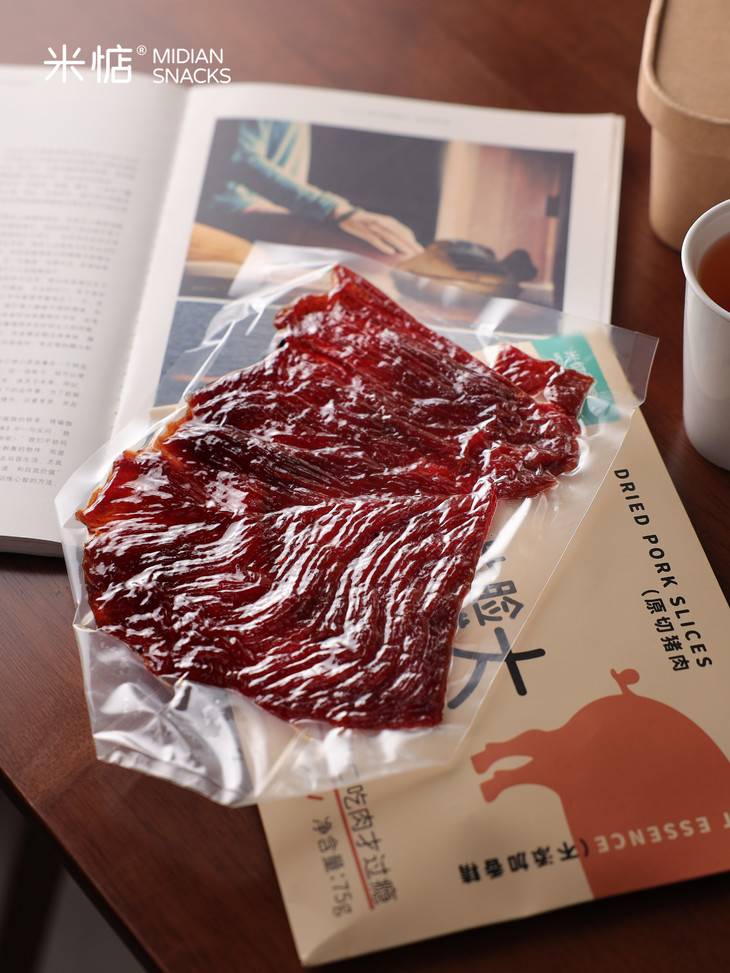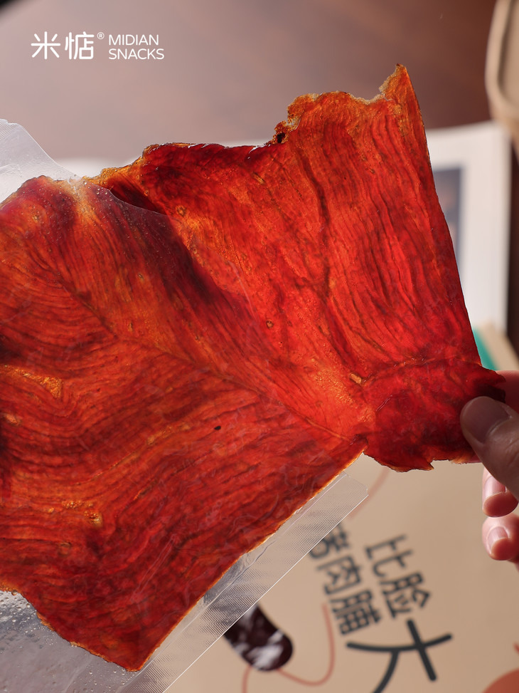 比脸大猪肉脯可不是盖的 是真真实实的好大一片 可以豪气的直接大口开啃 也可以矜持小口的撕着吃 酣畅淋漓的享受,太过瘾啦🤤 一撕开,浓浓的肉香钻进鼻子里☁️ 然后就迫不及待的大吃一口 咀嚼间香气在唇舌渐渐充盈 紧实有弾劲,油润润的一点不柴 咸甜留香,啃下一整片都不会腻