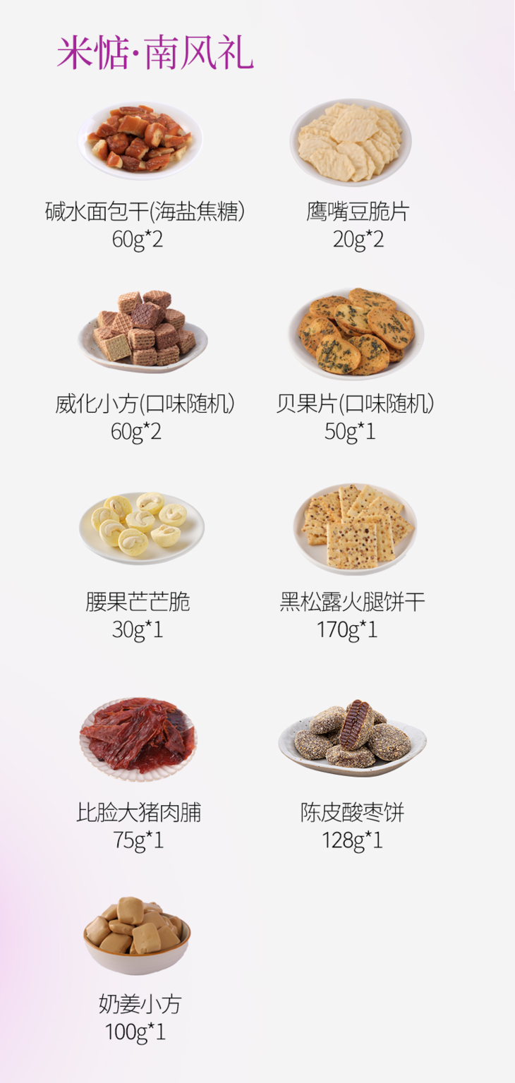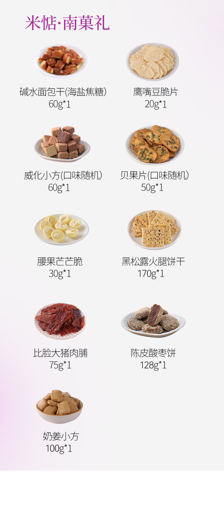 【商品规格】:碱水面包干60g*1、鹰嘴豆脆片20g*1 、腰果芒芒脆30g*1、威化小方60g*1、贝果片50g*1、黑松露火腿饼干170g*1、比脸大猪肉脯75g*1、陈皮酸枣饼128g*1、奶姜小方100g*1