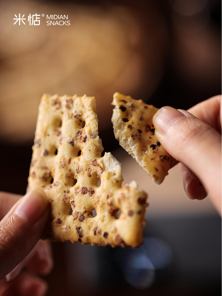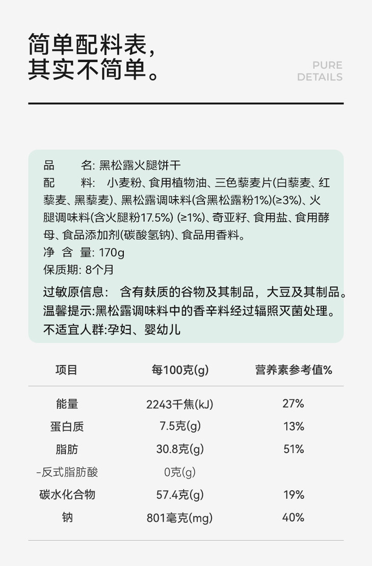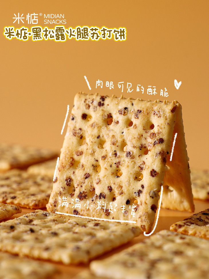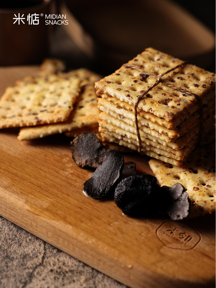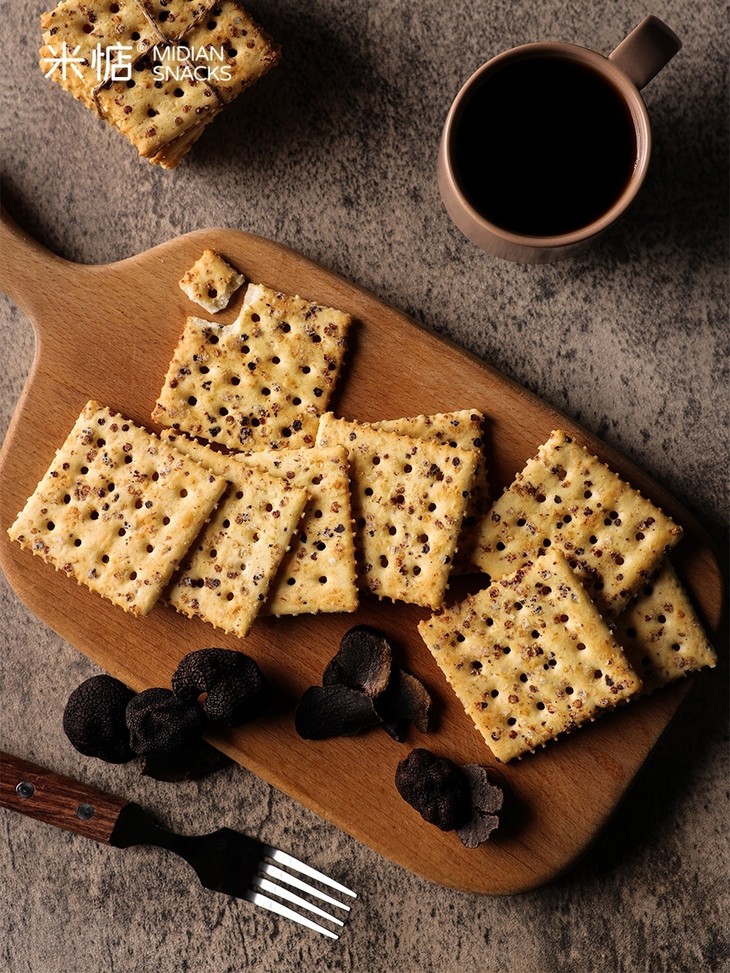 浓郁的黑松露搭配火腿风味,鲜甜咸香 饼干的每一寸都均匀的铺洒料粉,轻咸不油腻 休闲放松的时刻让味觉也来一场远行的旅游 去感受云南森林里的黑松露 看西班牙以果实为食的小猪🐖 回归现实以后,是谷物小麦的多种口感碰撞