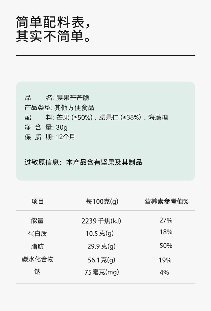 🔺芒果原浆添加量≥50%,不添加一滴水 🔺腰果仁添加量≥38%,恒温烘烤过年也不上火 🔺芒果与腰果的激情碰撞,好吃buff直接叠满 🔺海藻糖代替白砂糖,纯天然糖类,摄入轻负担 🔺采用FD 冻干技术锁鲜,营养不流失 好吃又安心