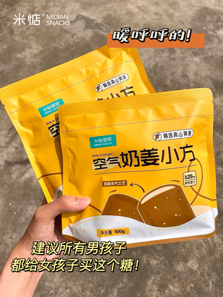 🟣空气奶姜小方——贴心小暖糖 长辈含蓄热烈的爱意就像这一方奶姜糖🫚 细腻呵护如口感顺滑,严厉和训诫如姜汁清辣 氤氲的热气、沸腾的茶水、咕嘟嘟冒泡的暖炉 只要回到家中,屋外就被那扇熟悉的大门轻轻隔绝 暖暖的奶姜,正适合暖暖的家🏠 一口含在嘴里,姜味缓缓散开,甜中透辣