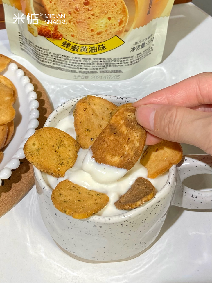 果然黄油搭配大蒜再铺满欧芹碎🧄 法式西餐的氛围感就出来了 浓郁到香气能弥漫整个房间 蜂蜜黄油味和可可味我也喜欢💕 高品质的蜂蜜和黄油经过无数次调配得出的黄金比例 实现了甜而不腻、咸中带甜的独特风味~ 作为第一主推口味,喜欢它的人也是最多滴~ 平时喜欢阿华田饮料的小伙伴们有福了 香醇细腻带有独特香气的阿华田被揉进每一寸面团里 黄油的油润浸透着每一片切割好的脆片 再经过烘烤来激发出大的香气