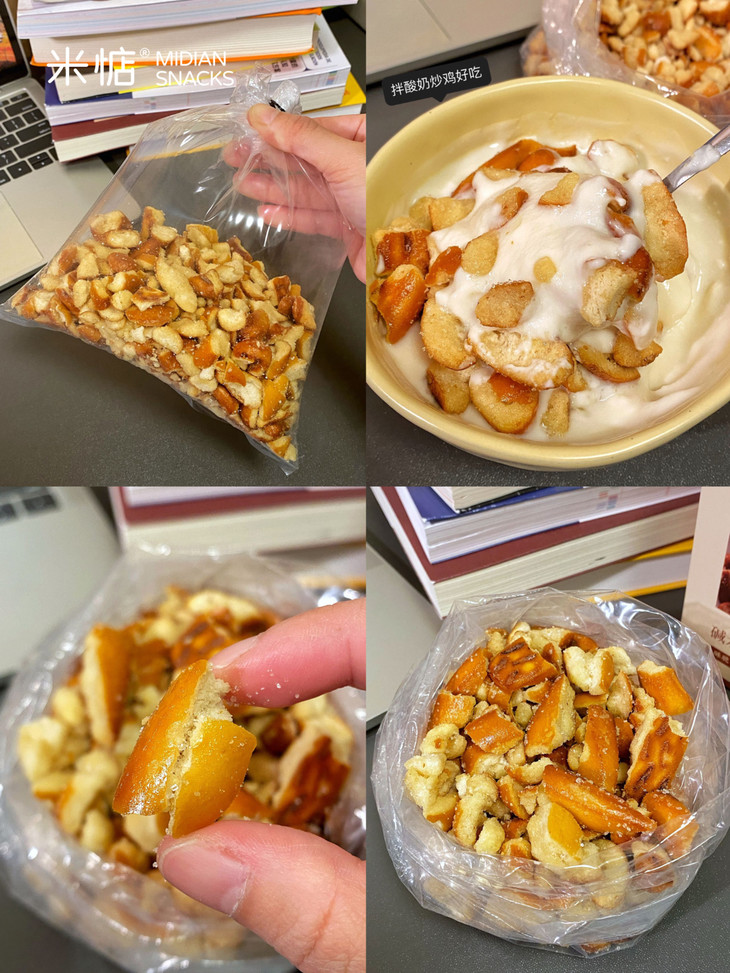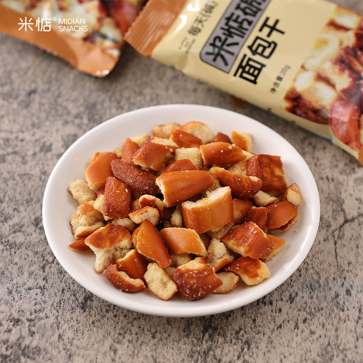 海盐焦糖口味的面包干,外面有一层海盐粒❄ 更加激发麦香和碱香,口感上层次更加丰富了 敲碎的每一块都是小巧思,四面八方裹满调料 一口下去浓香焦脆,吃完还会忍不住嗦手指 覆盖全年龄段小伙伴们的喜爱