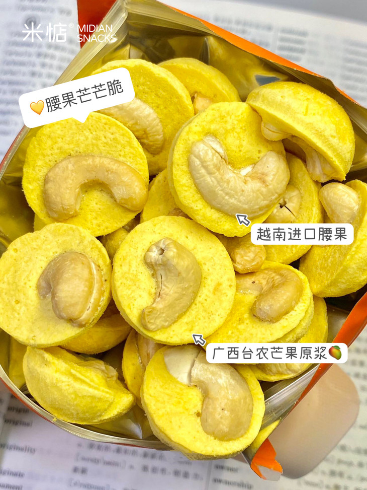 💖浓郁水果衣,焦香腰果仁 当腰果遇上水果,那会是怎么样的呢 美味buff直接叠满,果香浓郁香醇酥脆 选用广西台农芒果搭配坚果之首越南腰果 芒果的热带风情,坚果的油脂奶香 尽在一颗冻干之中,入口瞬间就能体验果汁四溅