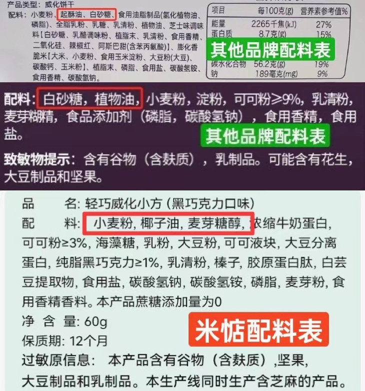 🔸拒绝复杂配料还原简单好味道 我们对比了市面上几款威化饼的配料表 白砂糖、起酥油、植物油在配料表中都是比较靠前🧨小惦则选择用椰子油和麦芽糖醇来代替 椰子油在抗氧化和提高新陈代谢方面有积极效果💯 而麦芽糖醇的甜度和热量相对于白砂糖更低↓ 更适合需要控制糖分以及追求健康的人群✔