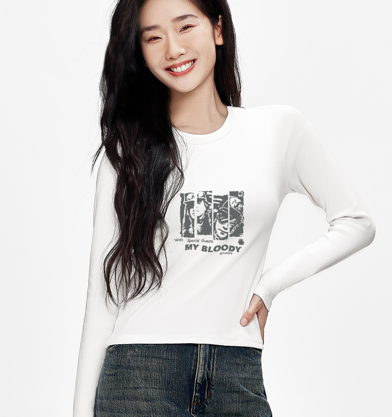 「棉的美学」显瘦修身长袖T恤印花秋季舒适辣妹内搭圆领打底衫