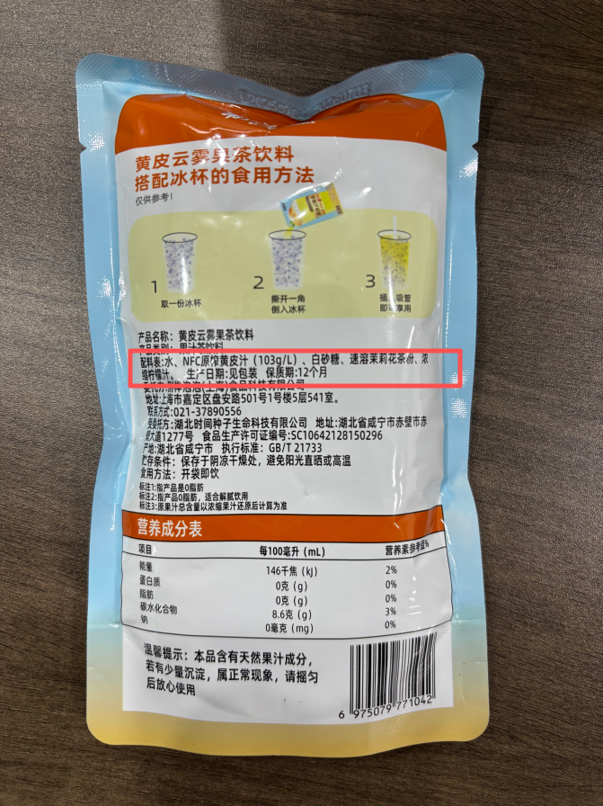 配料表干净:NFC原榨黄皮汁、白砂糖、速溶茉莉花粉、柠檬汁🧃🧃