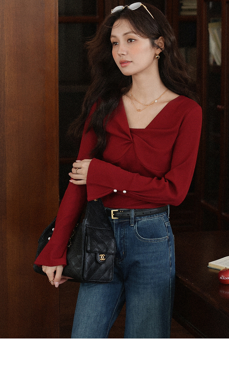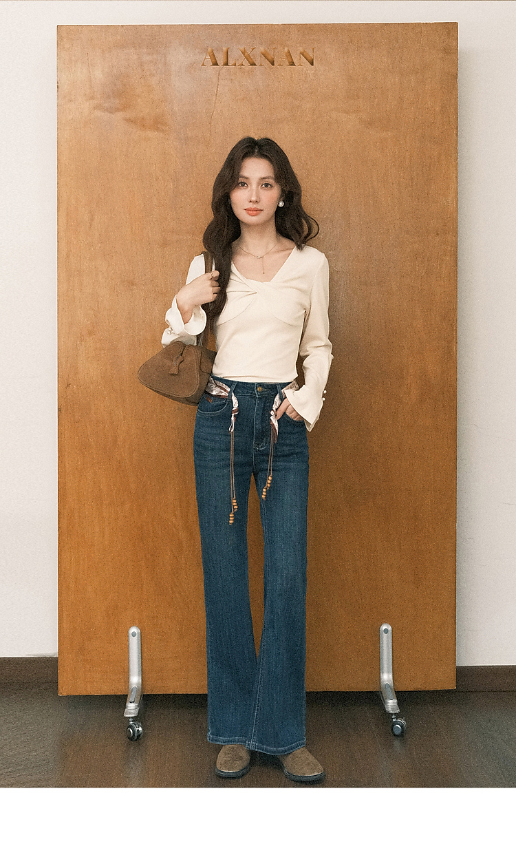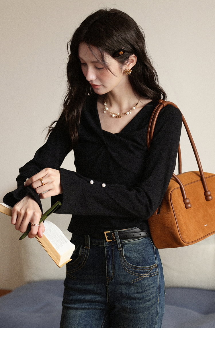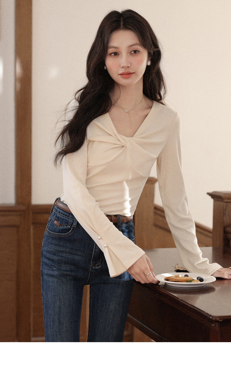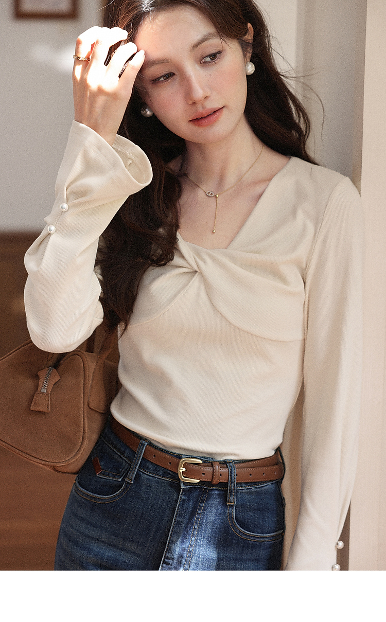 鹿向南「松露可可」米杏色长袖针织衫女秋新款设计感小众扭结上衣