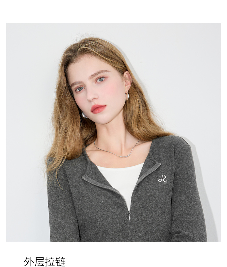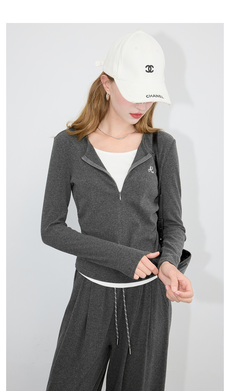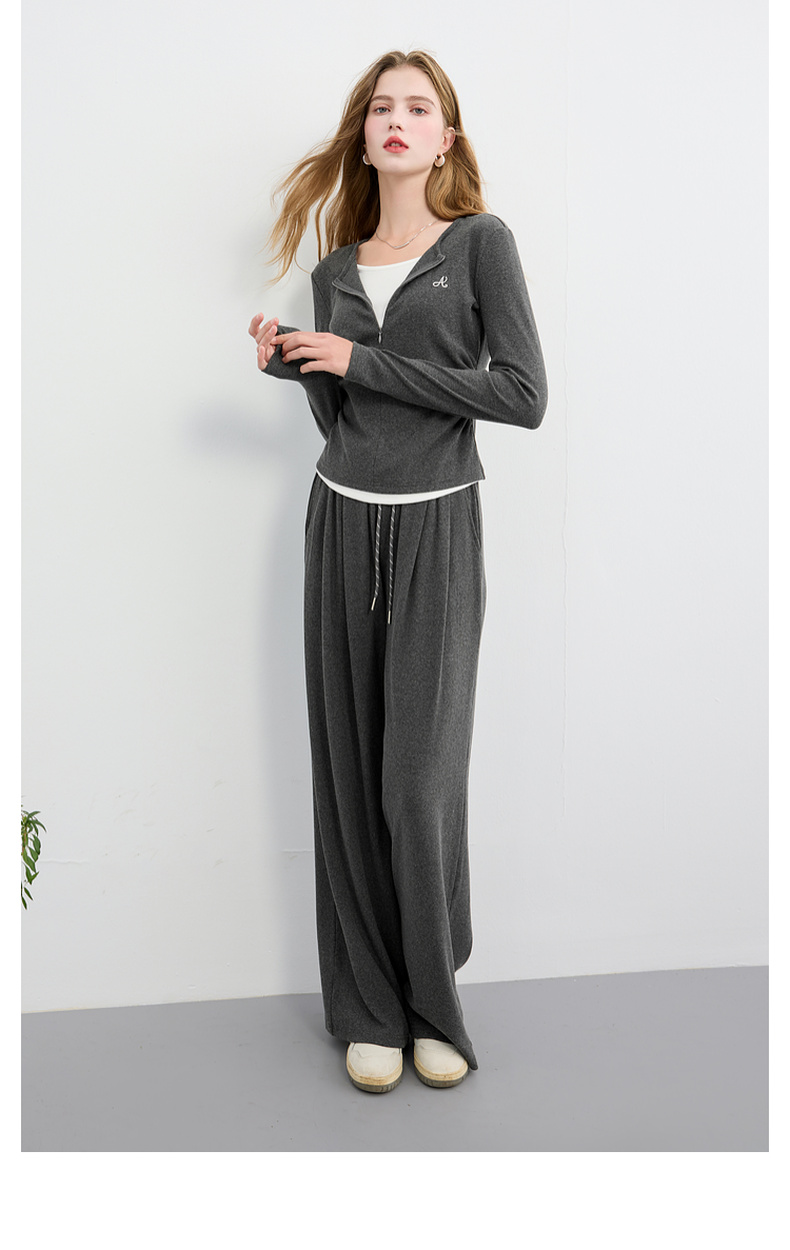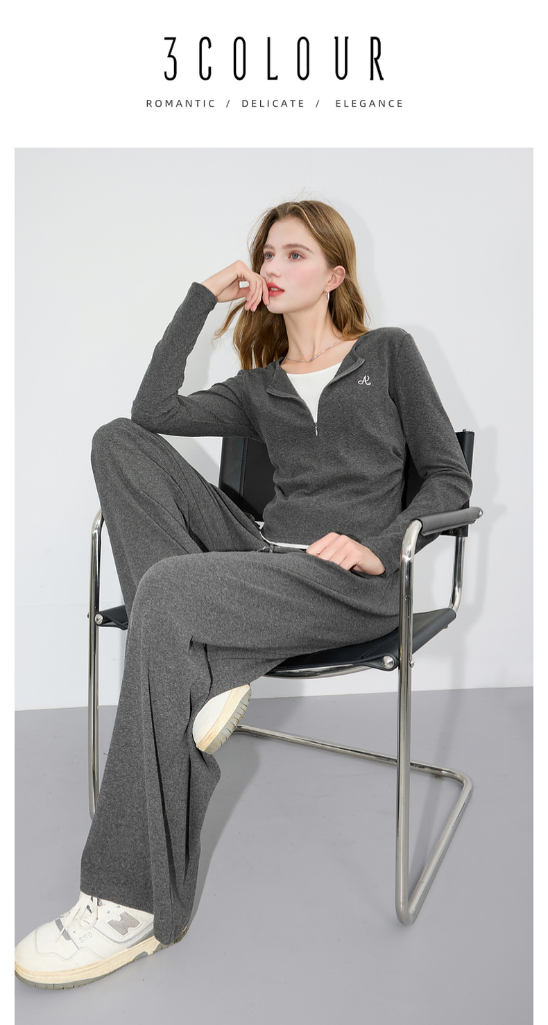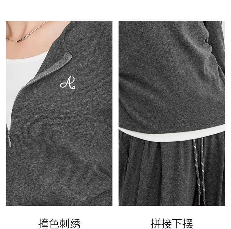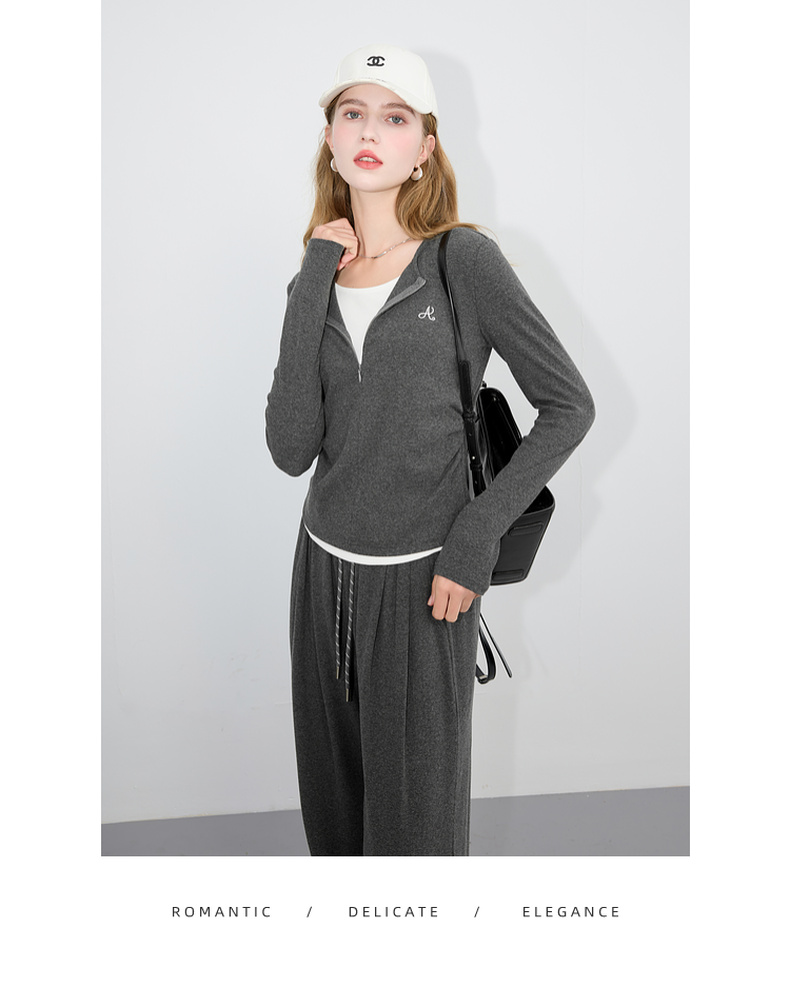 三彩2025秋季新款两件套休闲套装假两件刺绣套头衫直筒裤简约M