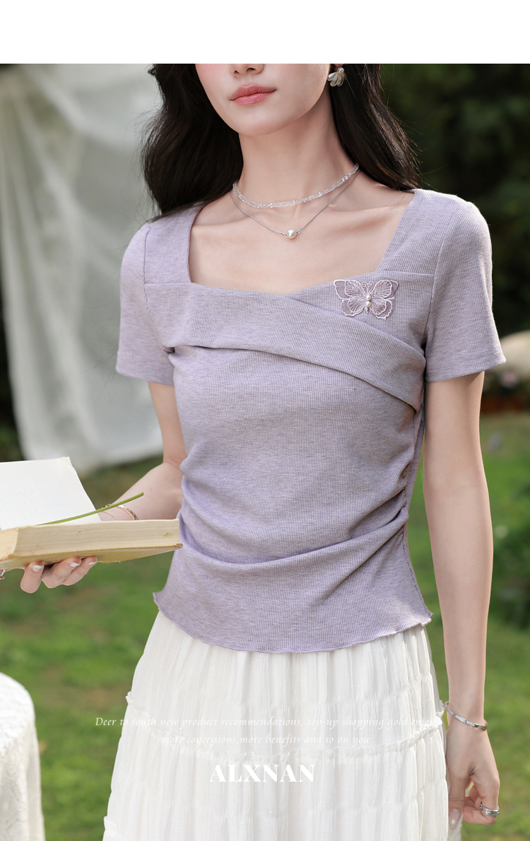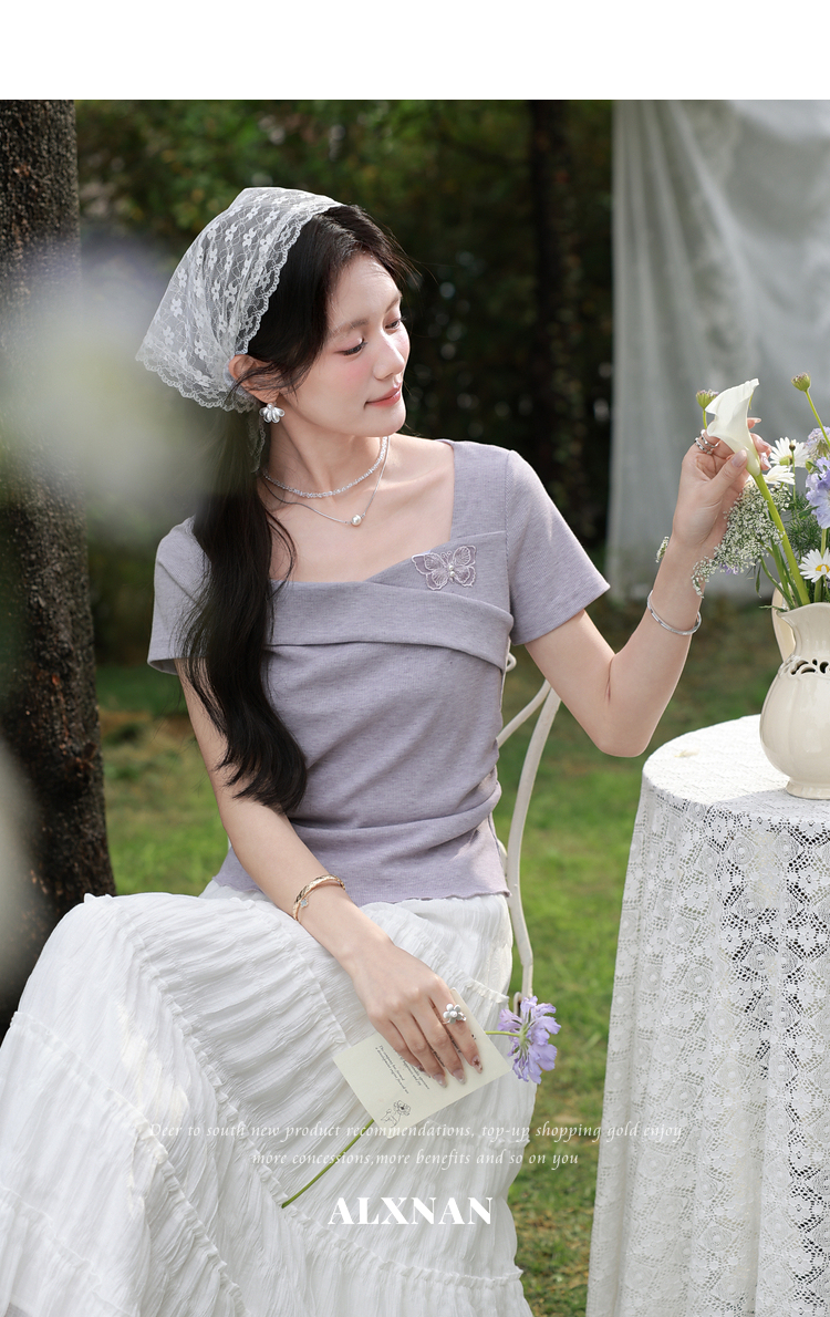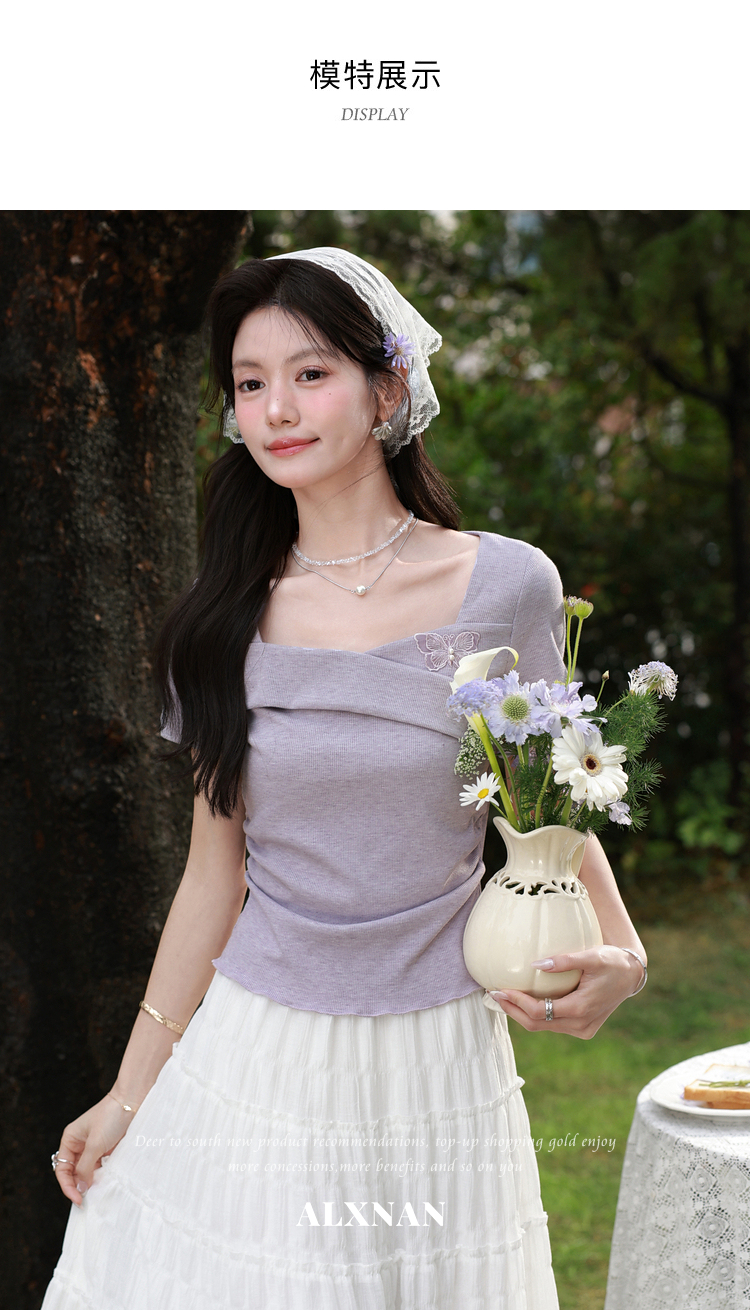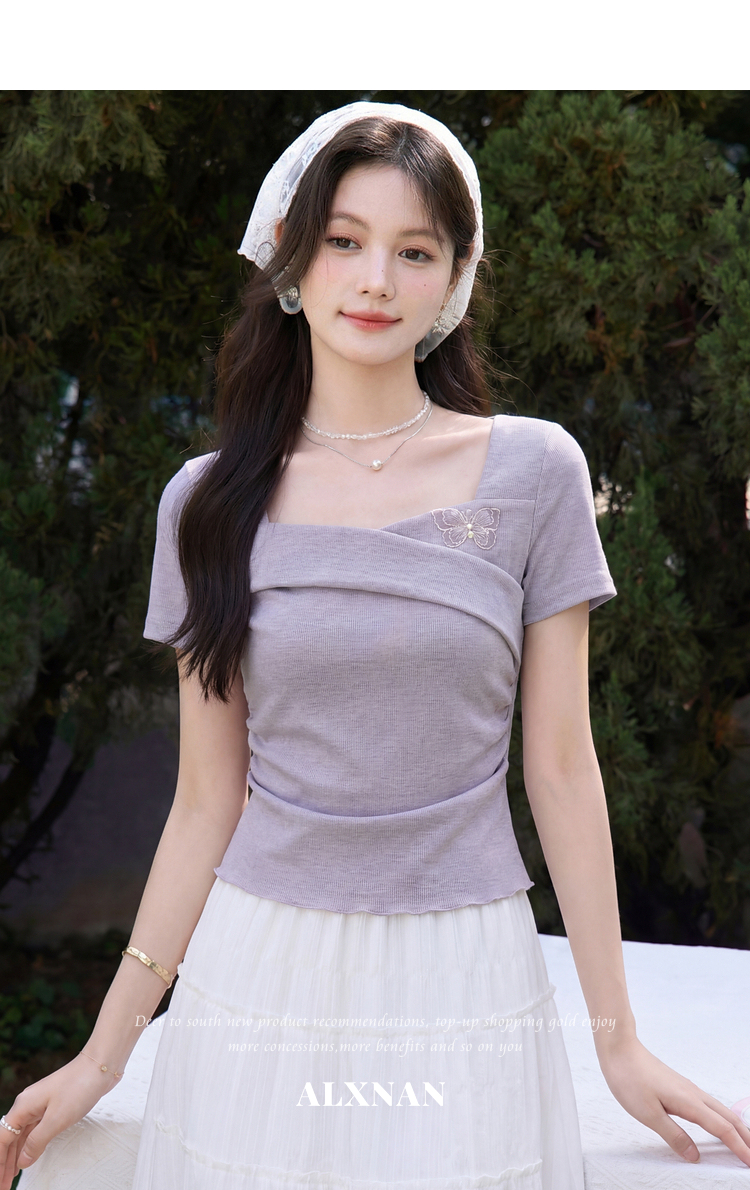鹿向南「星饰花梦」蓝色短袖T恤女夏季2026超火减龄修身开衩上衣