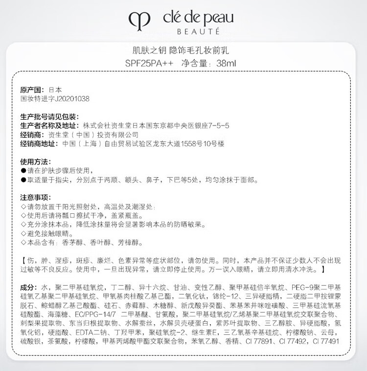 肌肤之钥(CPB)哑光长管隔离38ml 持妆妆前乳提亮肤色护肤