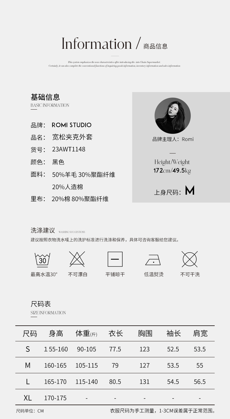 ROMI STUDIO500g精纺羊毛立领宽松哑光休闲立领夹克外套23AWT1148