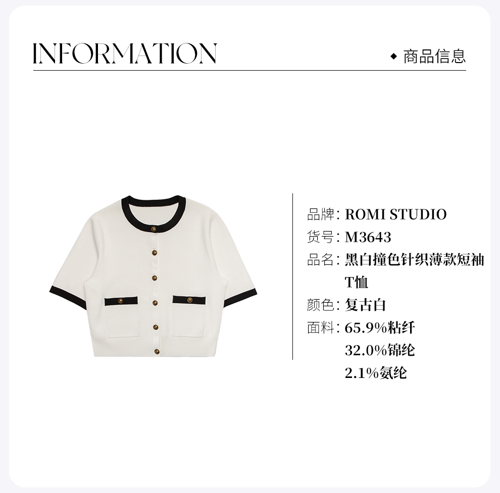 ROMI STUDIO“基础优雅”经典香香黑白撞色针织薄款短袖T恤 M3643