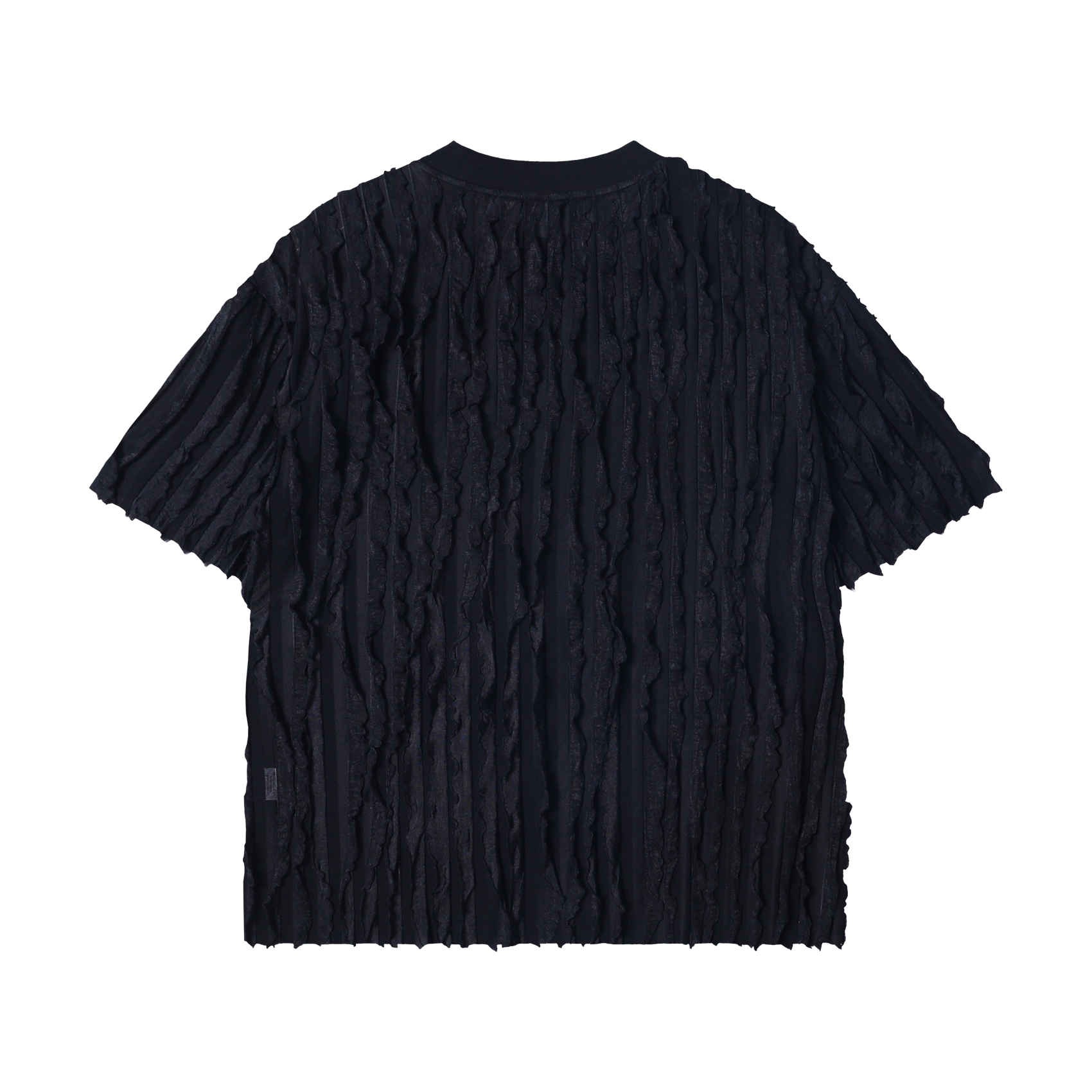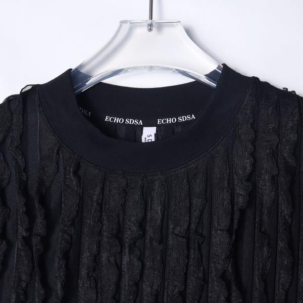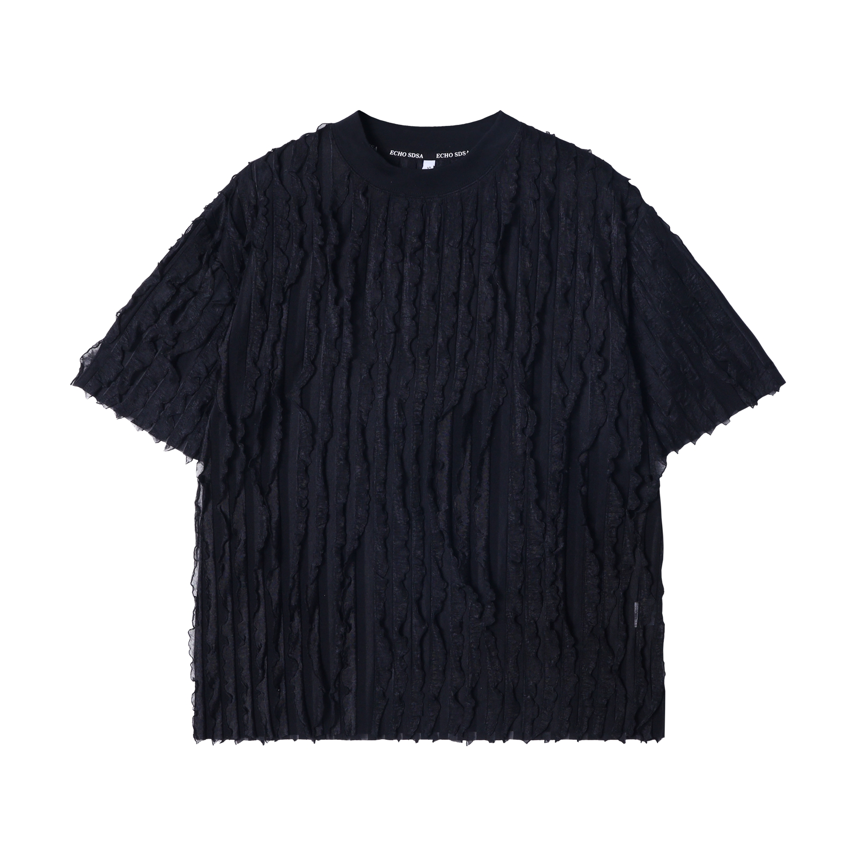 T2642夏季高级感新款美式简约条纹花边褶皱圆领短袖T恤百搭宽松上衣