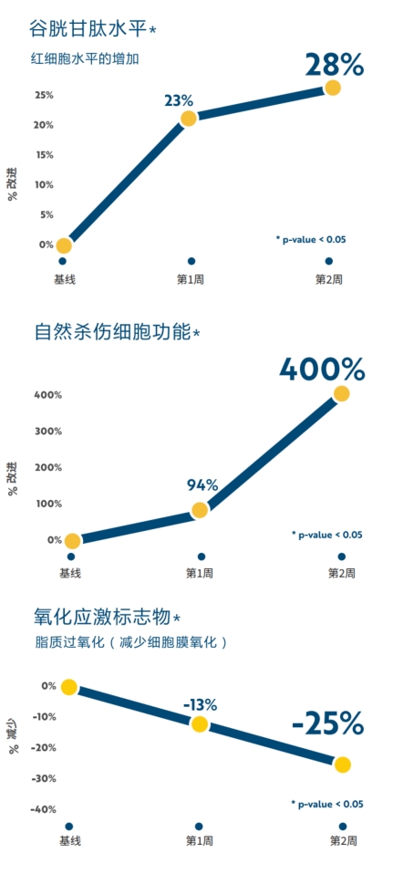 “这项试点研究的结果首次证明了在人体内口服脂质体谷胱甘肽后体内GSH储备的增加……而且效果在1周内就能看到。此外,脂质体谷胱甘肽对几个与GSH相关的参数产生了积极影响,包括减少氧化应激生物标志物和增强免疫功能。”