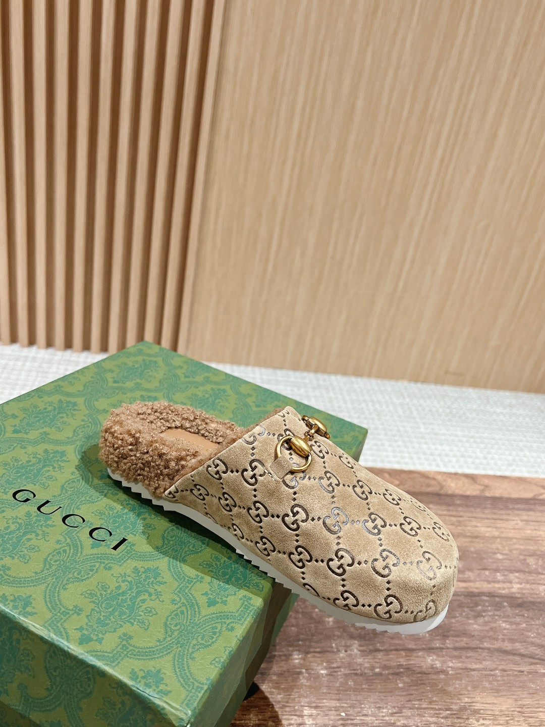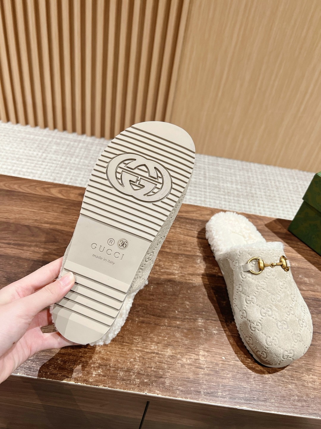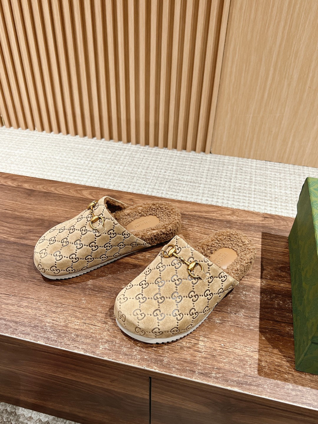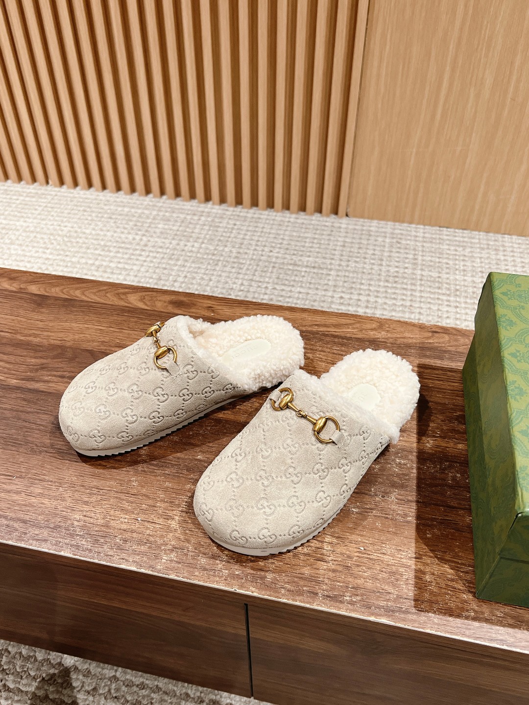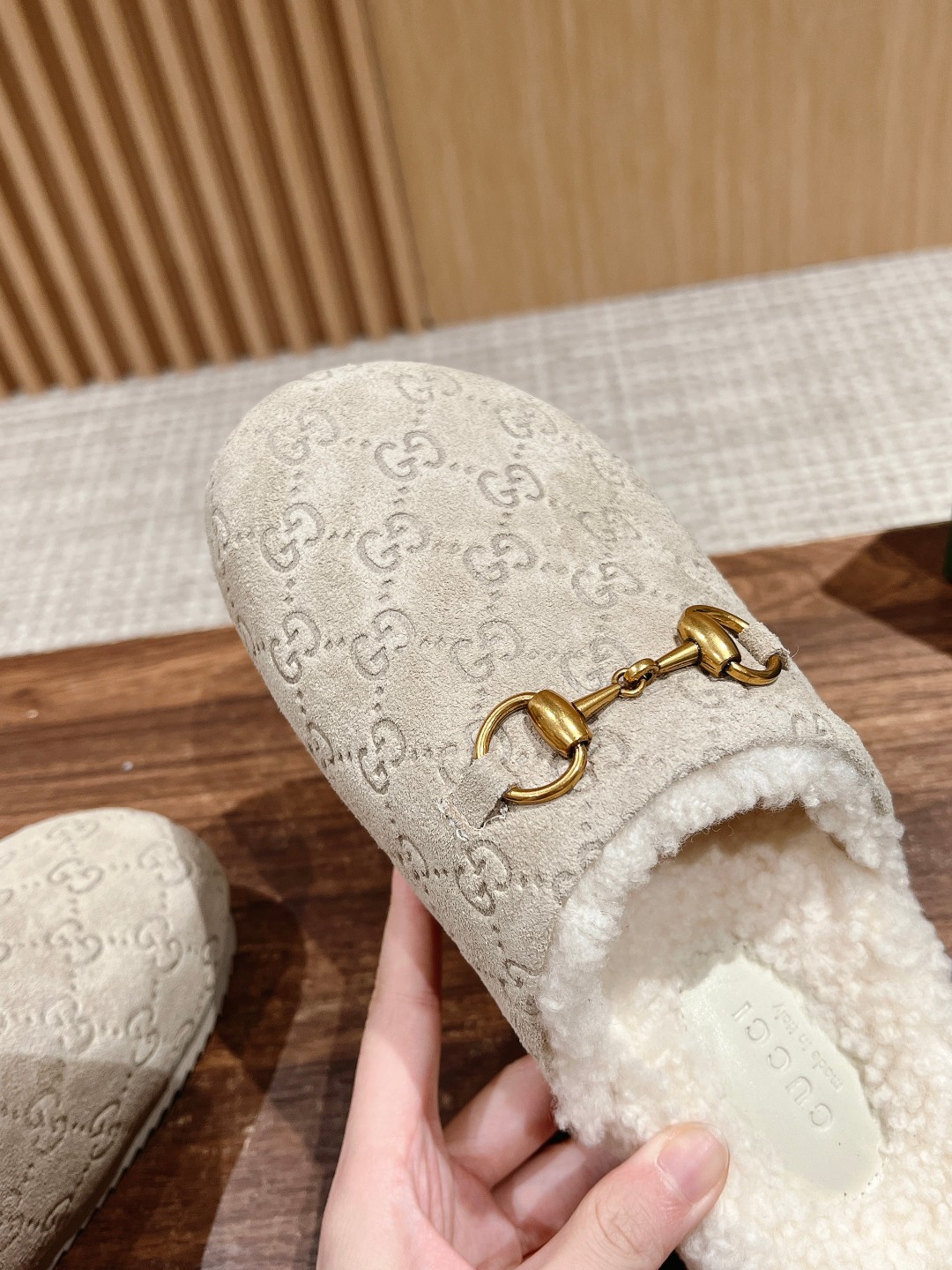 𝐆𝐔𝐂𝐂𝐈#古驰秋冬新款羊毛运动半拖 鞋面麂皮压印迷你 老花logo,拼接小牛皮,细节丰富,精致高级 皮毛一体羔羊毛,软软糯糯超舒服 原版开模胶天然橡胶鞋底
