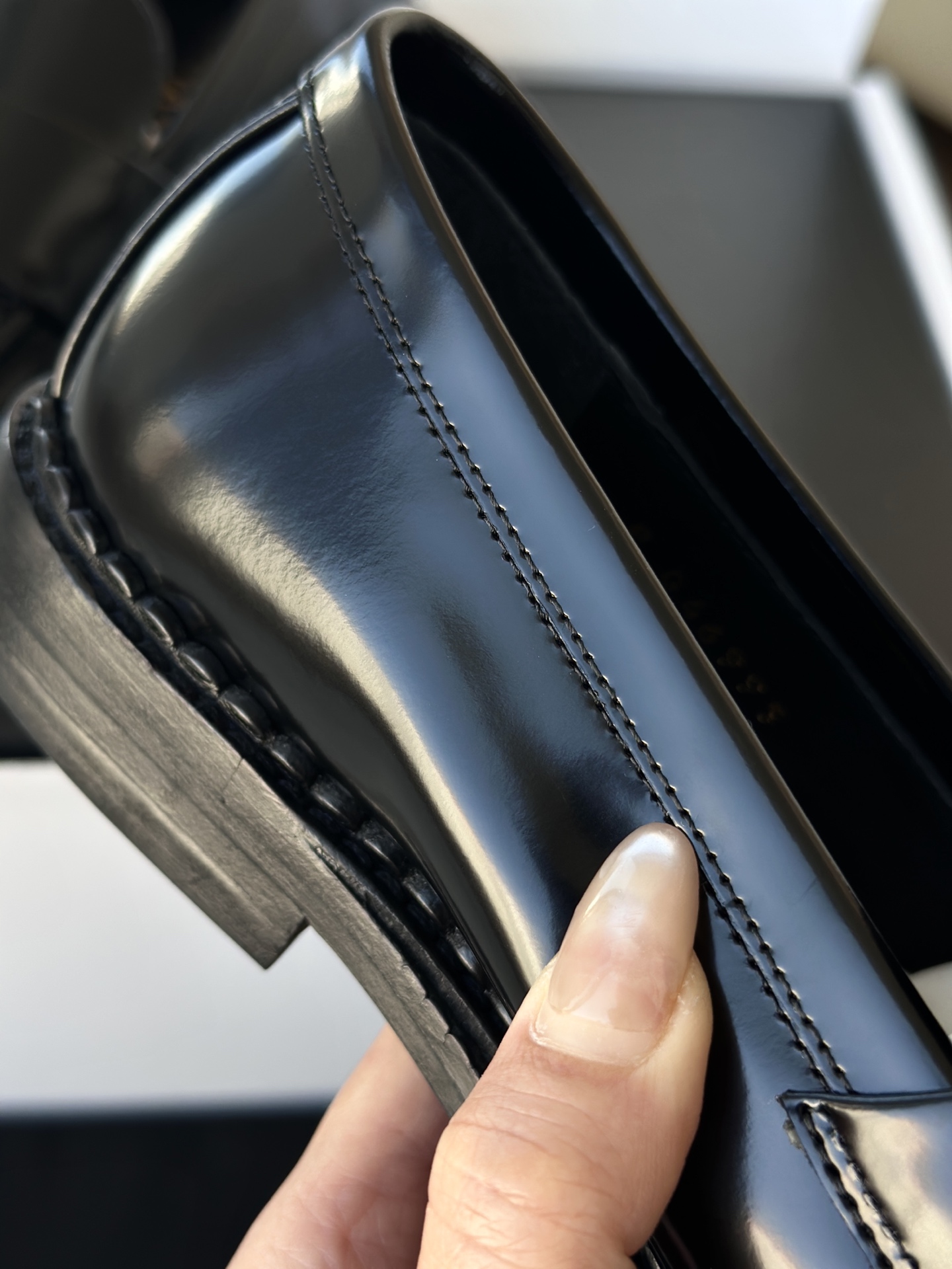细节质感真的绝到没话说!鞋面采用品牌定制开边珠牛皮 皮质紧实且带着细腻的珠光质感,上手摸能感受到皮具特有的软糯与挺括,光线下的镜面反光更是把高级感拉满。