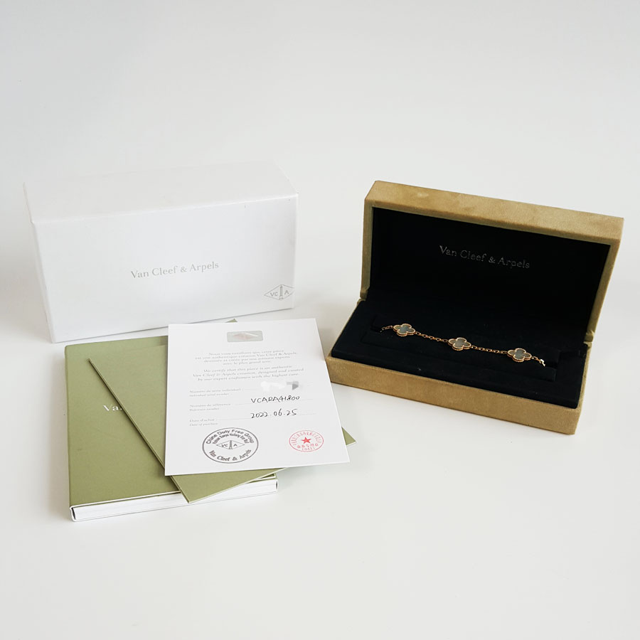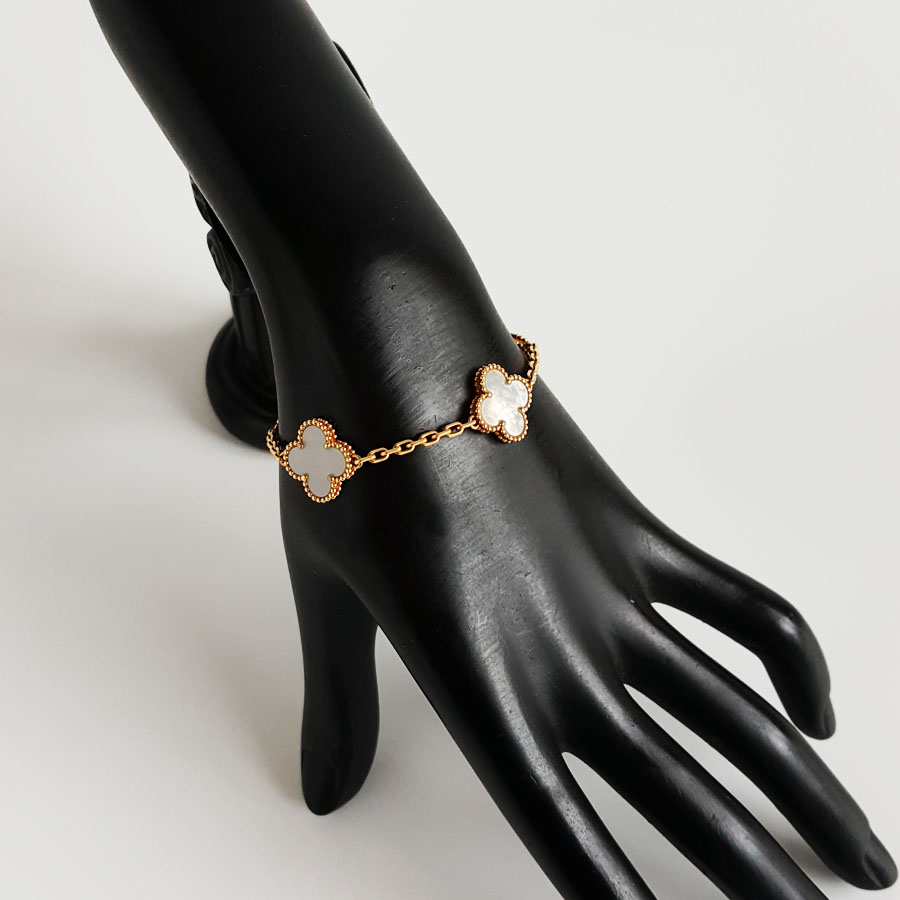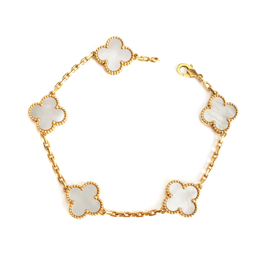 【95新】VCA梵克雅宝Vintage Alhambra系列VCARA41800 18K黄金镶白贝母四叶草白五花手链女士现售价:26300!310725AK10