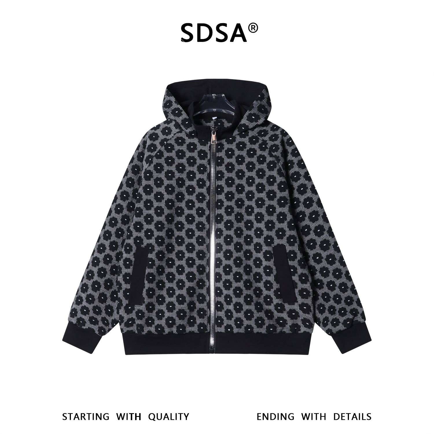 WT308SDSA男士秋冬新款痞帅男装潮牌撞色满印花朵拉链立领连帽卫衣百搭