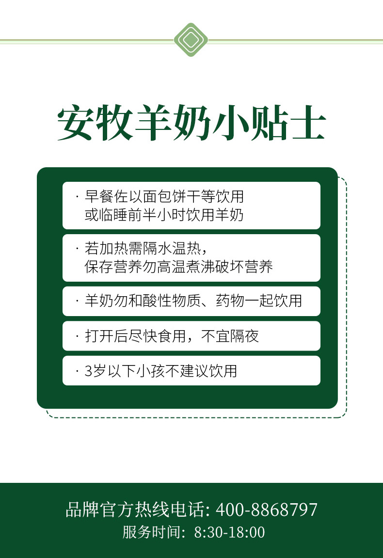 【温馨提示】因冬季气温过低,导致羊奶出现冻住的情况,属正常,请放置在屋内使其自然解冻,不影响口感,请放心饮用。