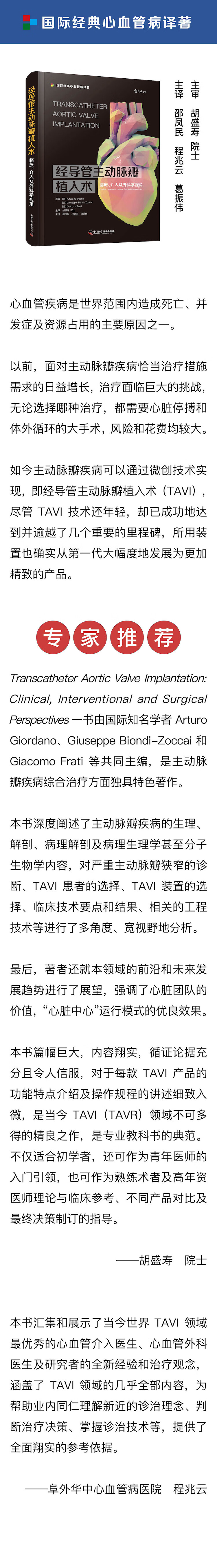 中文版序 经导管主动脉瓣植入术,也称经导管主动脉瓣置换术,从第一例成功人体植入至今已近 20 年,期间经历了第一代产品初登大雅的“青涩”,第二代产品的更新和改进,再到目前处于高歌猛进的第三代产品研发,产品的易植入性得到很大改进和提升,临床经验日益丰富,影像系统更加成熟,从而保证了临床效果的确切性,极大减少了TAVI 术后瓣周漏、永久起搏器植入、血管损伤及大出血等并发症的发生。同时,临床适应证也已从Z初不能承受外科手术或外科手术高风险的患者向中风险患者扩展,目前也正在进行 TAVI 应用于外科手术低风险患者的临床研究;而且针对单纯性主动脉瓣关闭不全、主动脉瓣二叶畸形,甚至融合再生医学的血流动力学及耐久性更佳的产品已经面世。TAVI 相关的临床应用循证医学研究也正如火如荼地进行。可以明确地说,目前这一项技术一定会使越来越多临床工作者的技术水平得到扩展和提升,Z终使广大心脏病患者获益。 诚如本书原著者的前言所述,尽管在此之前曾有零散关于 TAVI 的专业著作面世,但从未有一部专著像本书一样堪称里程碑式的教程。由国际Z名学者 Arturo Giordano、Giuseppe Biondi-Zoccai 和 Giacomo Frati 等共同主编的主动脉瓣疾病综合治疗著作Transcatheter Aortic Valve Implantation:Clinical, Interventional and Surgical Perspectives 一书独具特色。作者对主动脉瓣疾病的生理、解剖、病理解剖及病理生理学甚至分子生物学都进行了深度阐述,从多角度、宽视野就严重主动脉瓣狭窄的诊断、TAVI 患者的选择、TAVI 装置的选择、临床技术要点和结果、相关的工程技术等分别进行了详尽的讲解分析。本书Z后,作者就本领域的前沿和未来发展趋势进行了展望,强调了心脏团队的价值,“心脏中心”运行模式的优良效果。本书篇幅巨大,内容翔实,循证论据充分且令人信服,对于每款 TAVI 产品的功能特点介绍及操作规程的讲述细致入微,是当今 TAVI(TAVR)领域不可多得的精良之作,是专业教科书的典范。不仅适合初学 者,还可作为青年医师的入门引领,也可供熟练术者及高年资医师作为理论和临床参考、不同产品的对比及Z终决策制订的指导。 喜闻阜外华中心血管病医院程兆云教授联合我国 TAVI Z名专家团队共同将此英文专业巨著译成中文,以飨广大中国学者,我甚为欣喜。近几年来,其团队无论是在心血管疾病的防控上,还是在临床治疗及基础研究、学术推广上均励精图治,获得了国内甚至国际上同行的瞩目和肯定。著作翻译工作枯燥乏味,远没有科研、临床工作生动多样、充满吸引力,而且翻译工作需要在繁重的临床工作之余进行。但是,这样的工作意义非凡、影响深远,对这个领域的广大学者深有裨益。我相信,他们细致、认真,不辞辛劳的努力,一定能在本书中文版得到体现,将使更多有志于且一直关注经导管主动脉瓣疾病介入治疗策略的基础研究人员、器械研发人员、临床工作者、工程学领域等工作者深获裨益! 祝贺《经导管主动脉瓣膜植入术:临床、介入及外科学视角》中文版面世! 中国工程院院士 国家心血管病中心主任 中国医学科学院阜外医院院长 胡盛寿