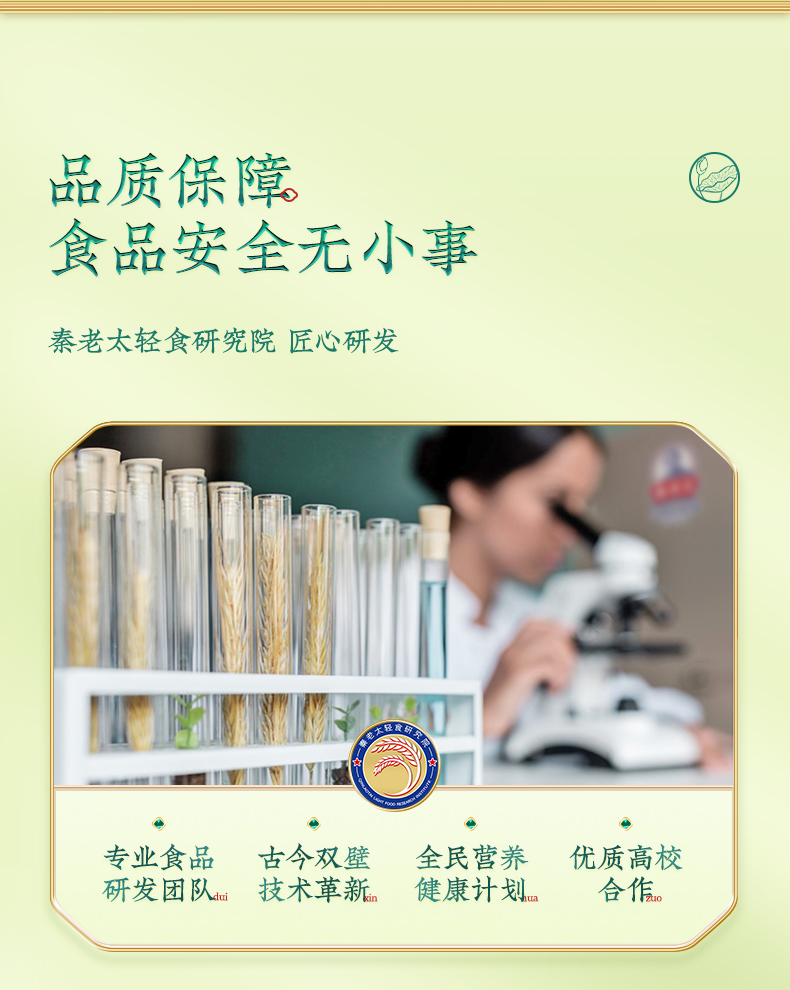 秦老太创始于1993年,专注谷物轻食餐。秦老太茶汤,2012年被正式授予非物质文化遗产。进入新时代,秦老太人怀揣匠心精神,以 “为家人制造食品”为理念,传承中华食养文化!