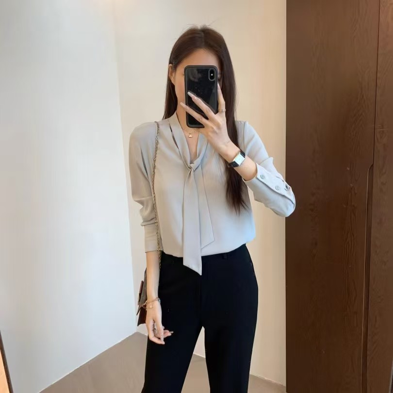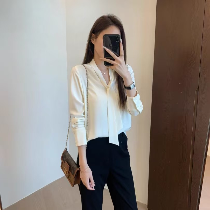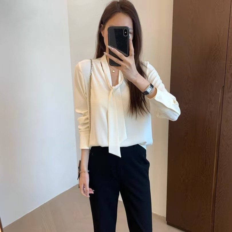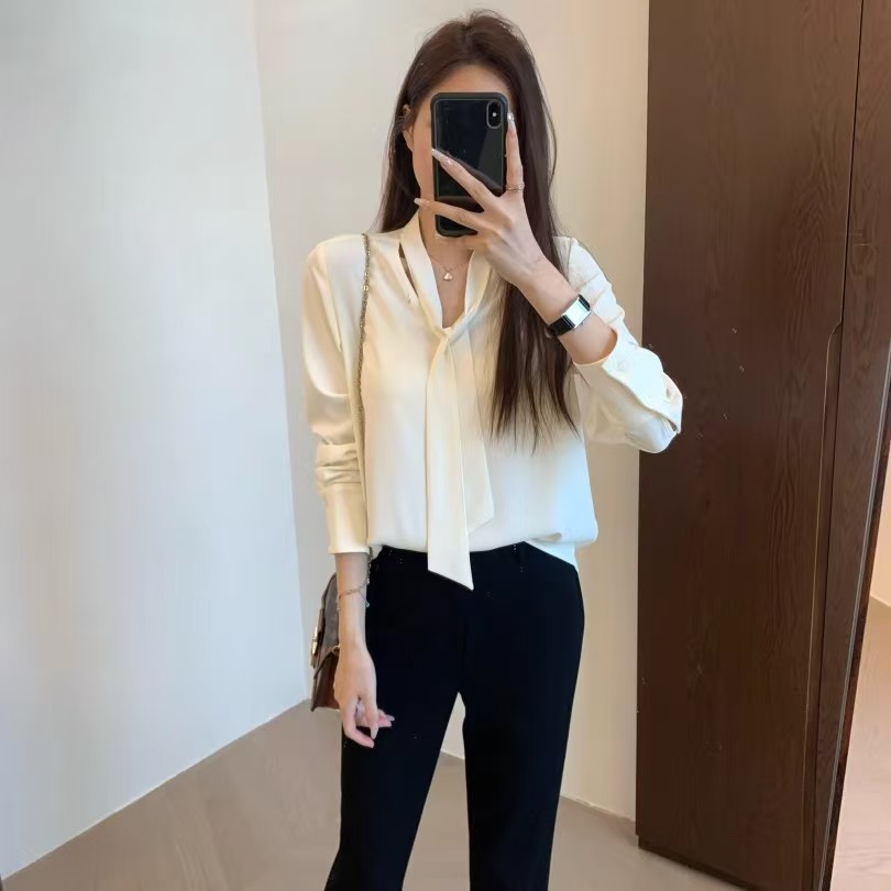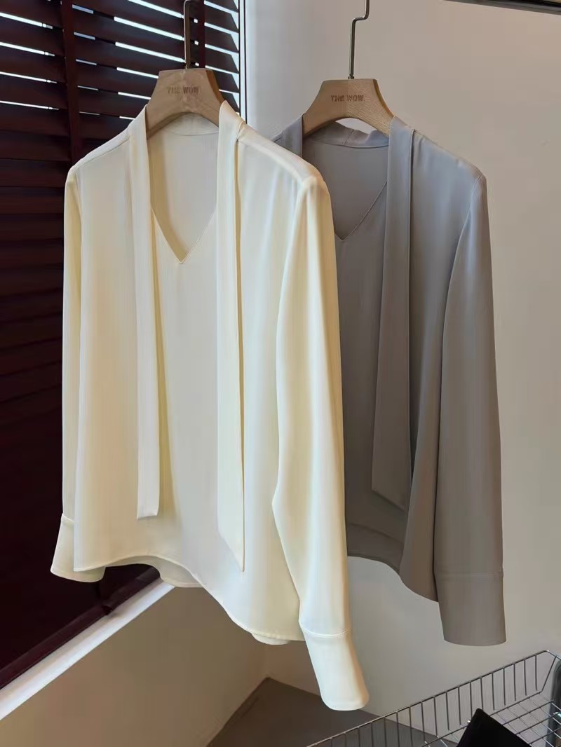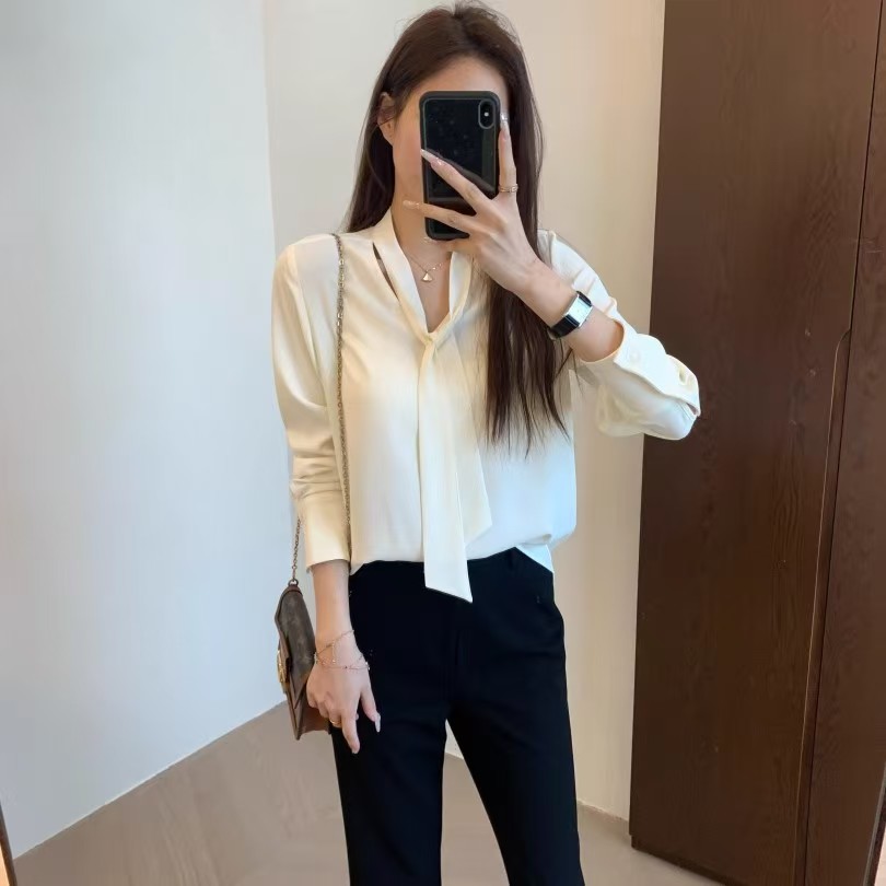 早春新品来一款简约气质法式V领套头温婉雅致飘带衬衫