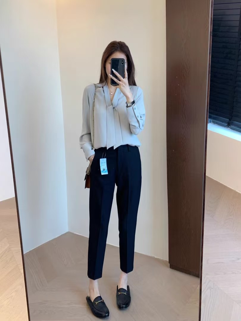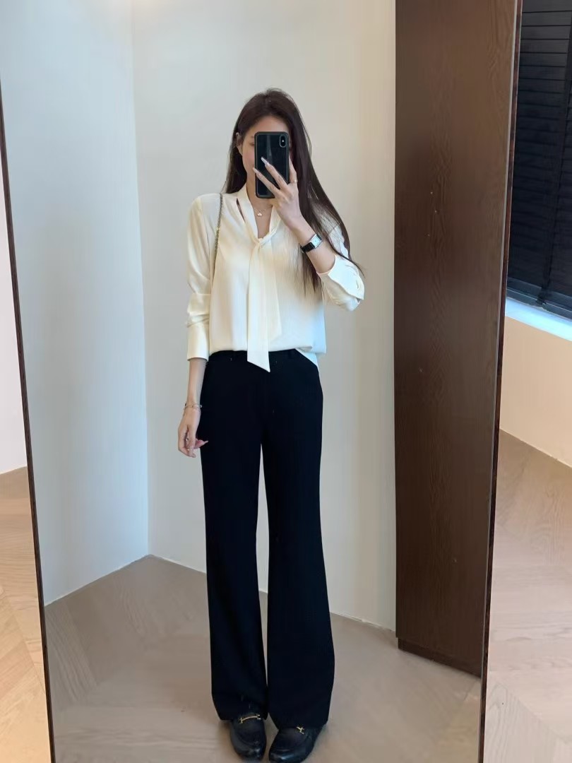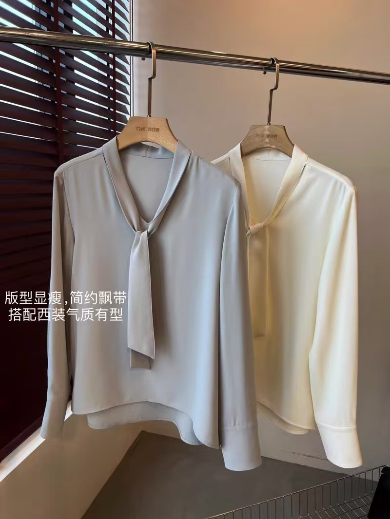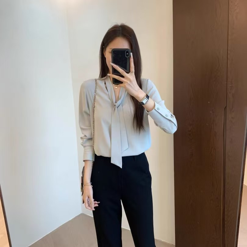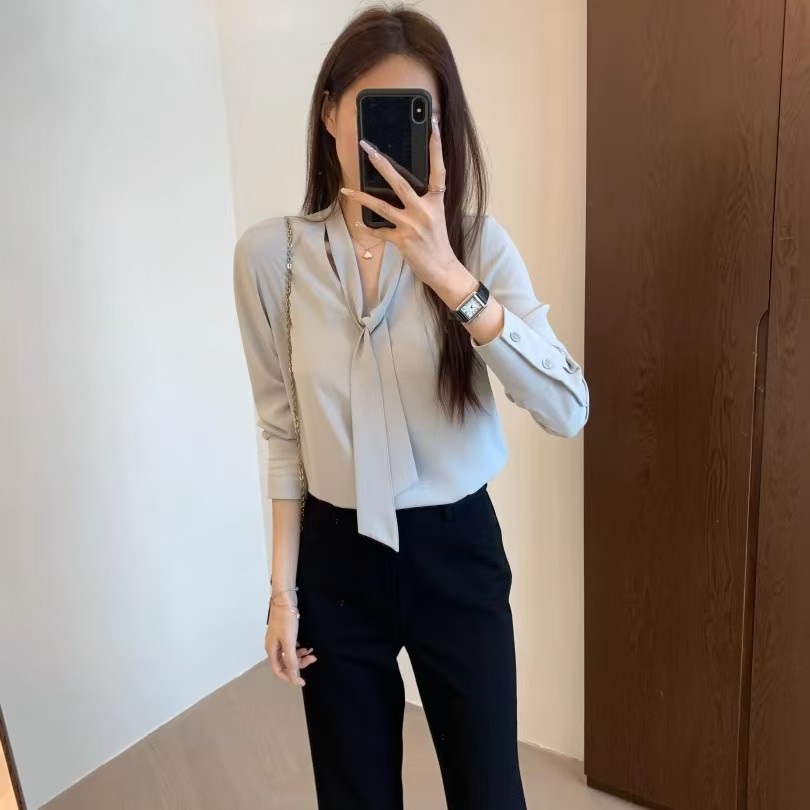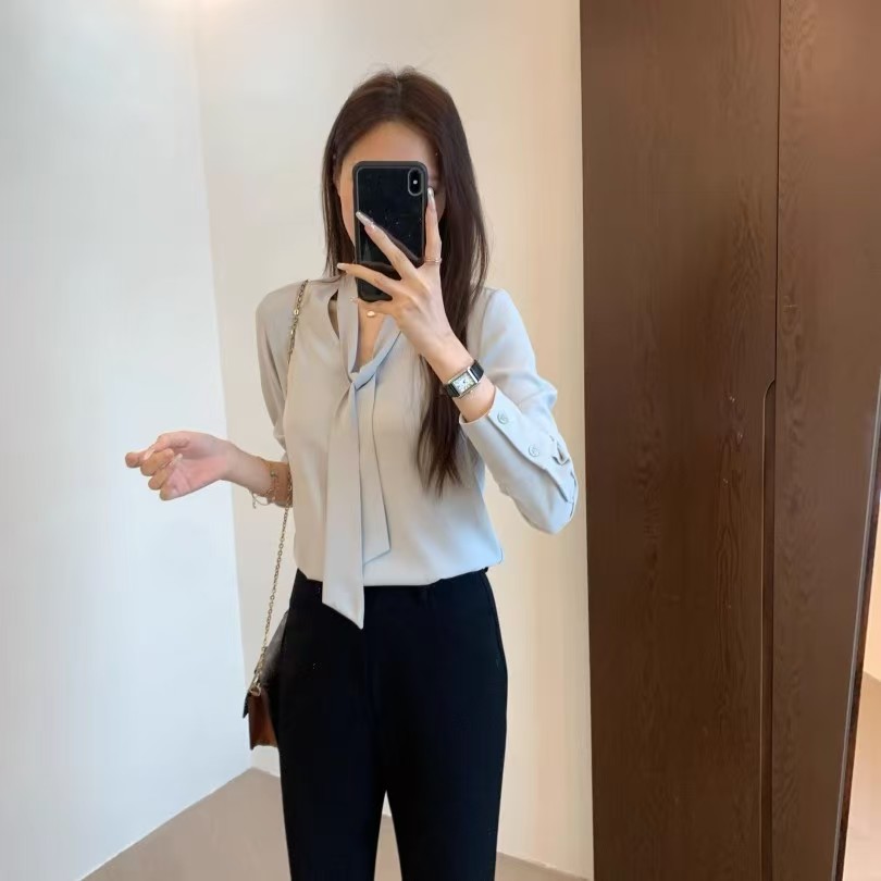 早春新品来一款简约气质法式V领套头温婉雅致飘带衬衫