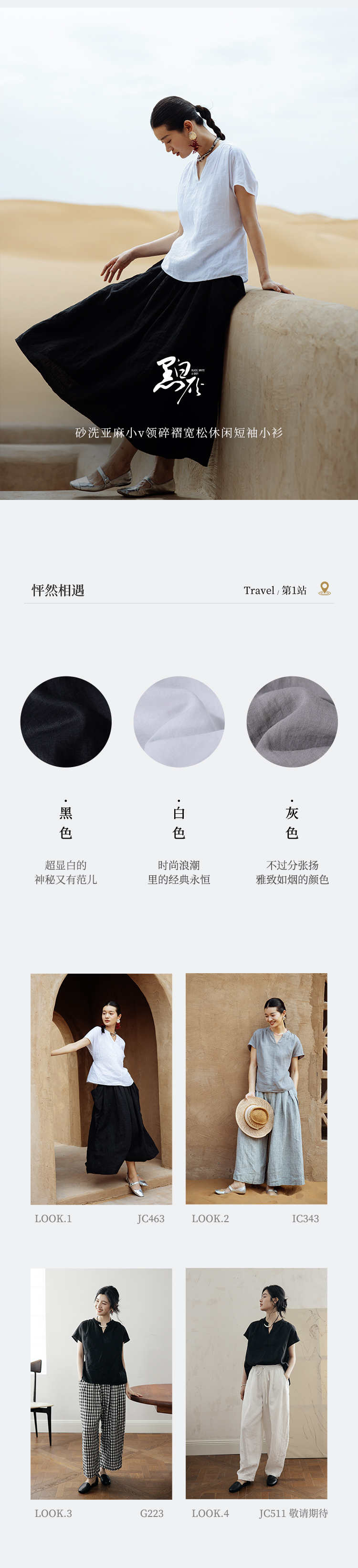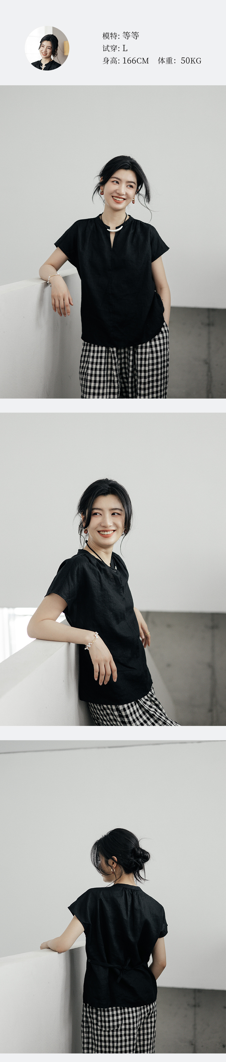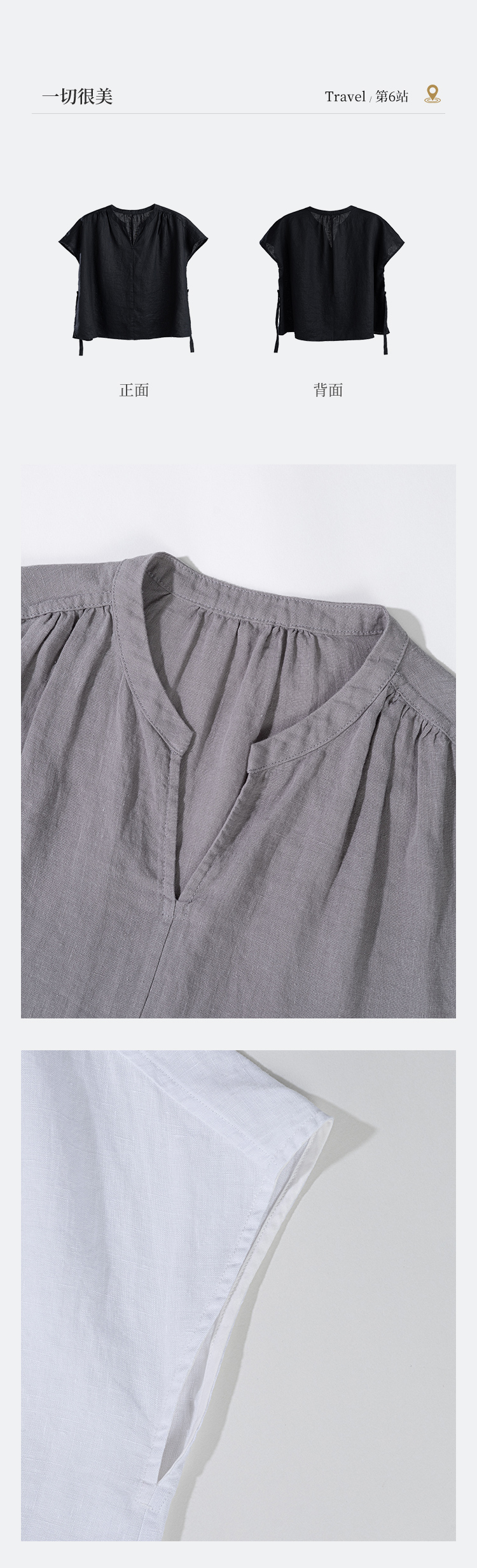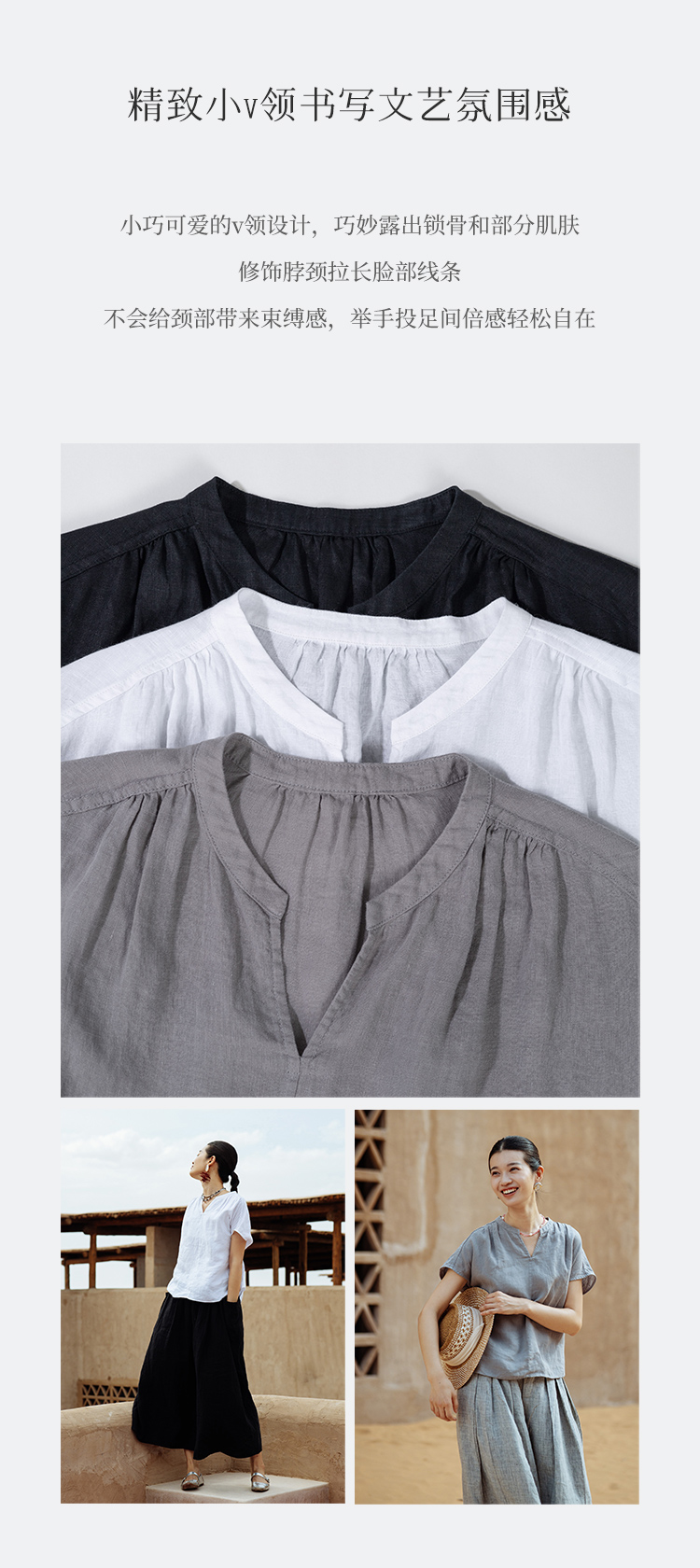 绽放481朵【黑白灰系列·俏佳人】文艺砂洗亚麻T恤小衫V领短袖
