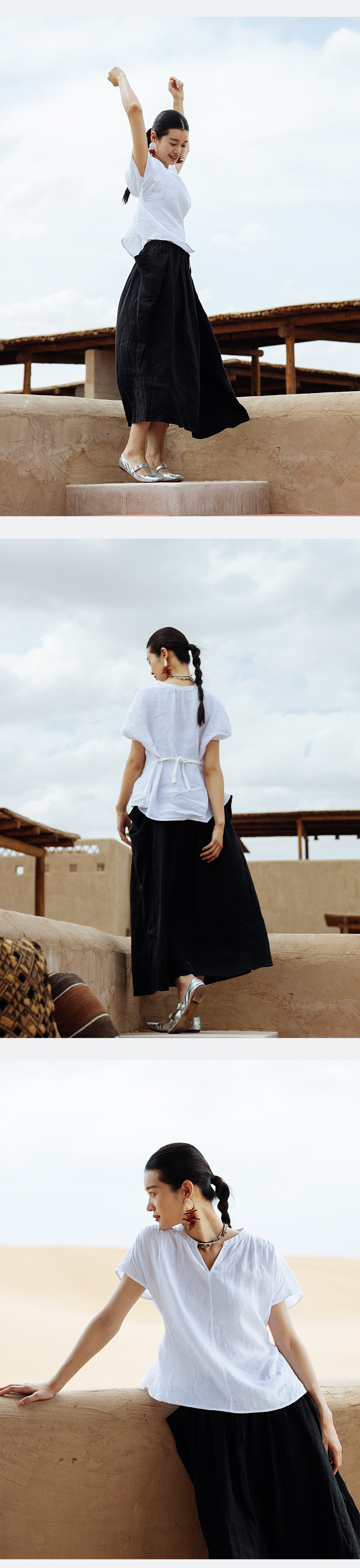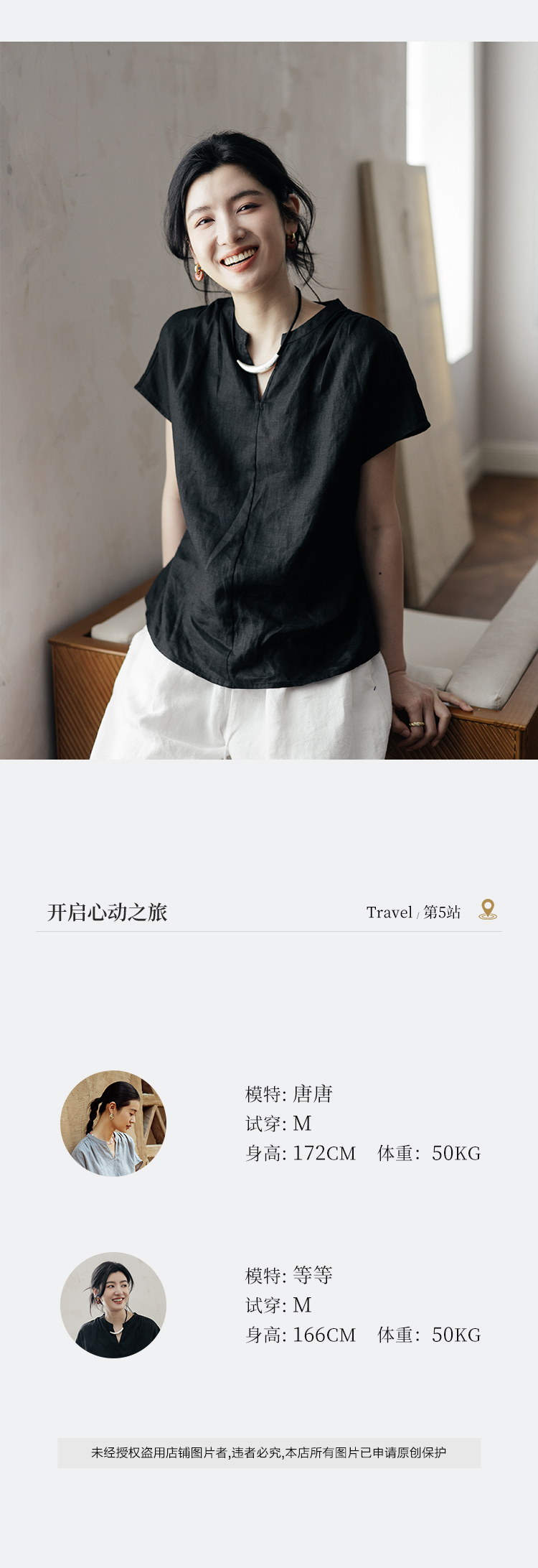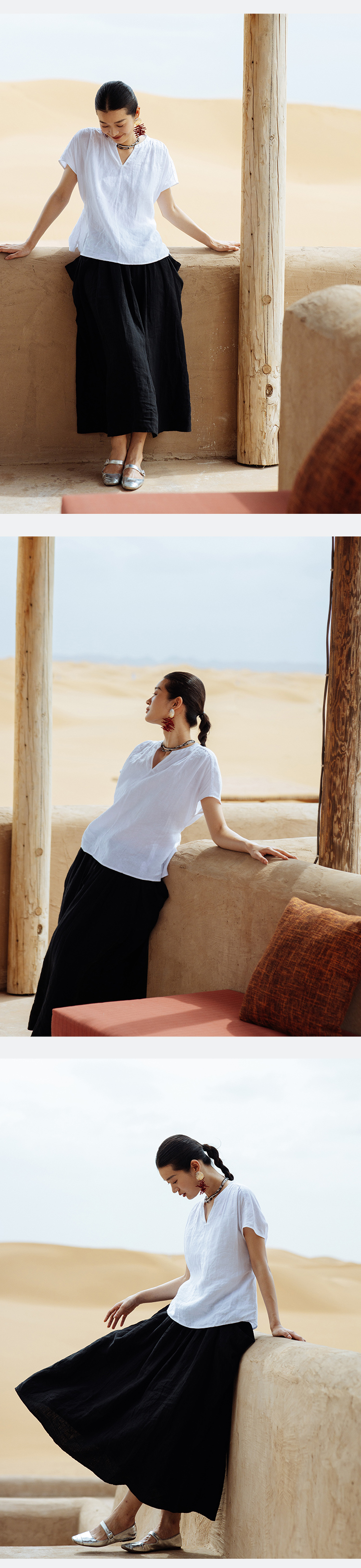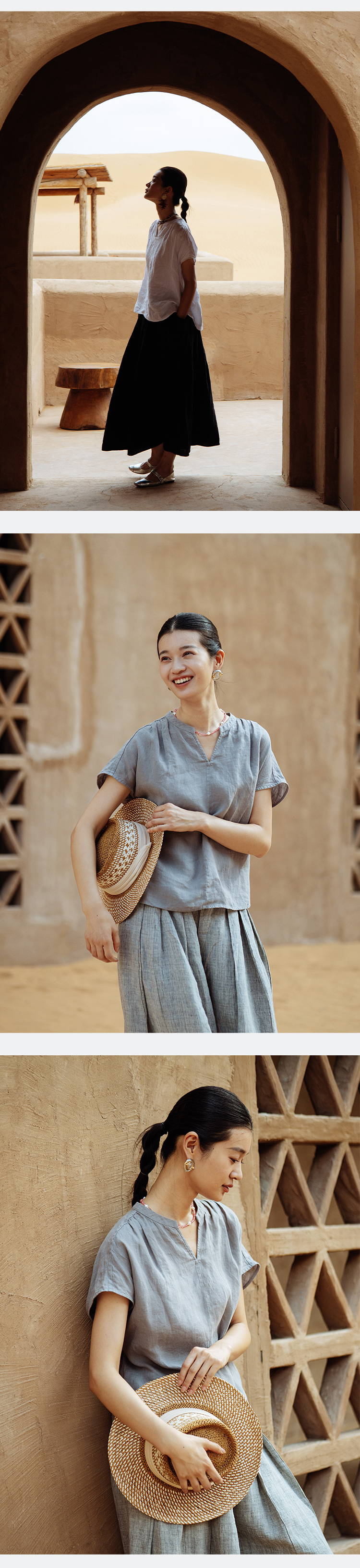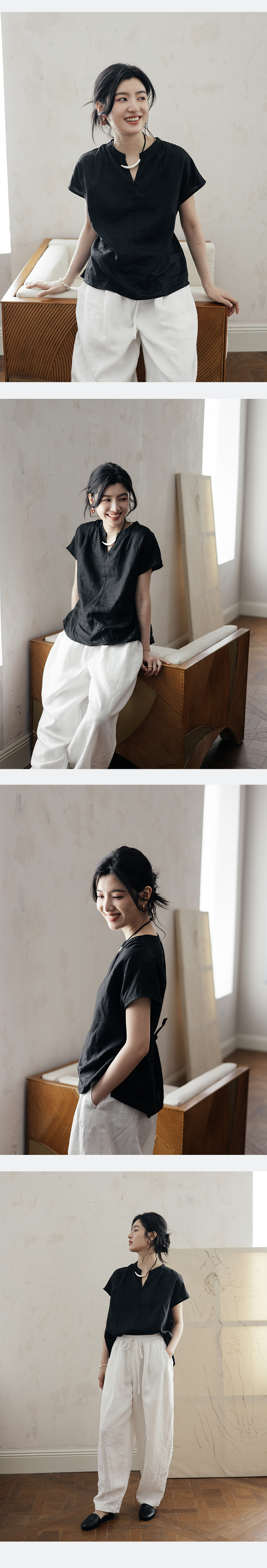 绽放481朵【黑白灰系列·俏佳人】文艺砂洗亚麻T恤小衫V领短袖