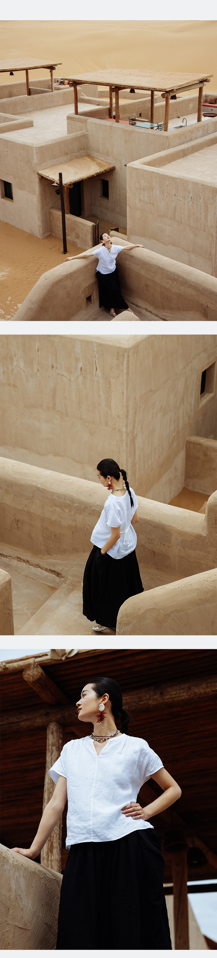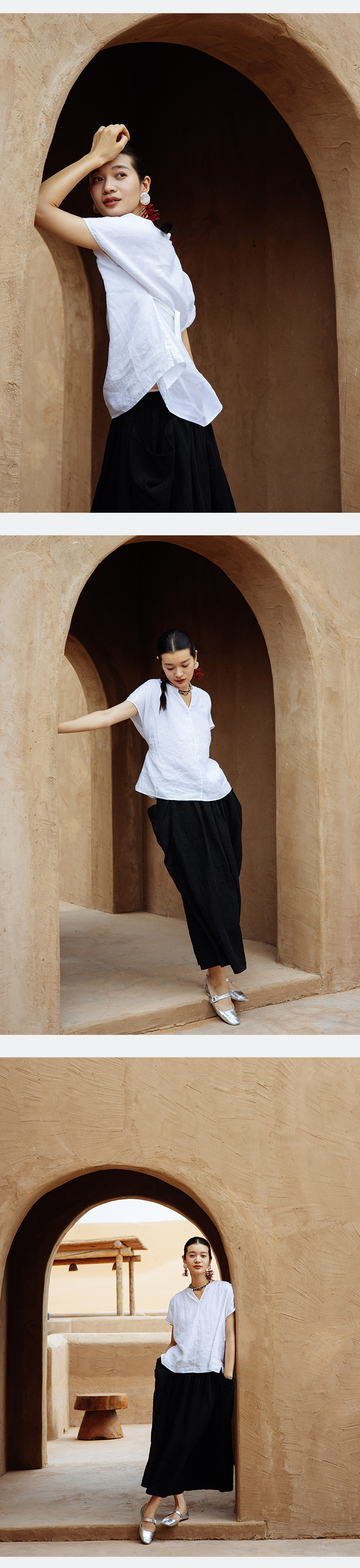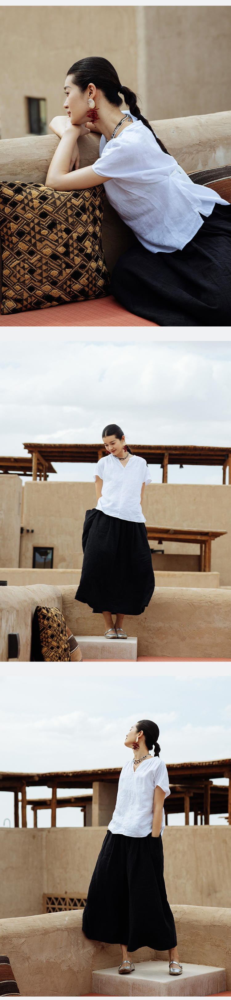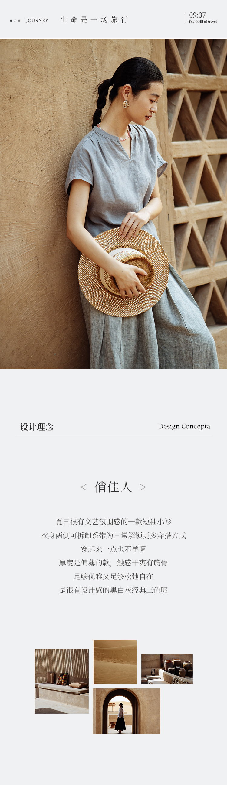 绽放481朵【黑白灰系列·俏佳人】文艺砂洗亚麻T恤小衫V领短袖