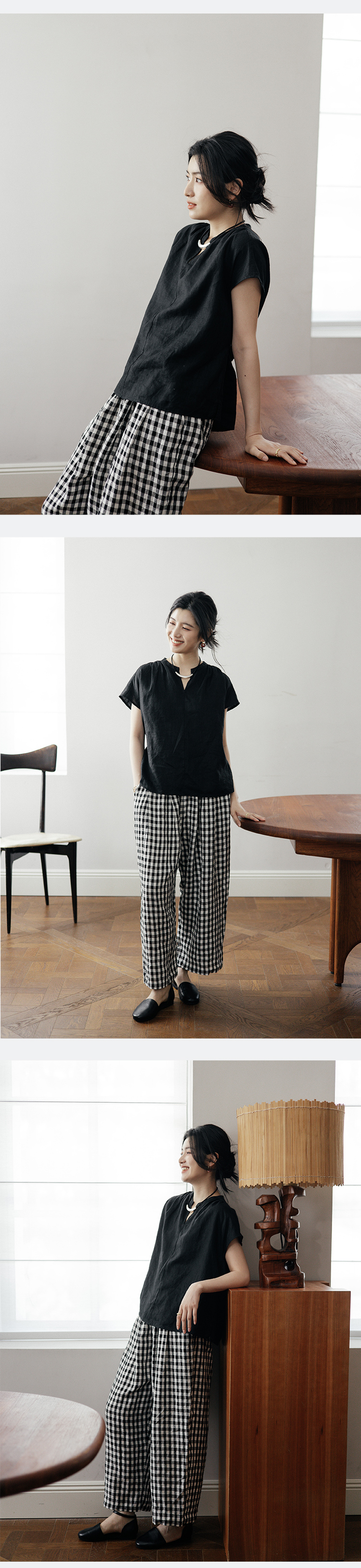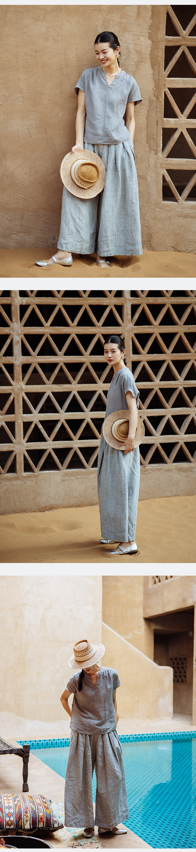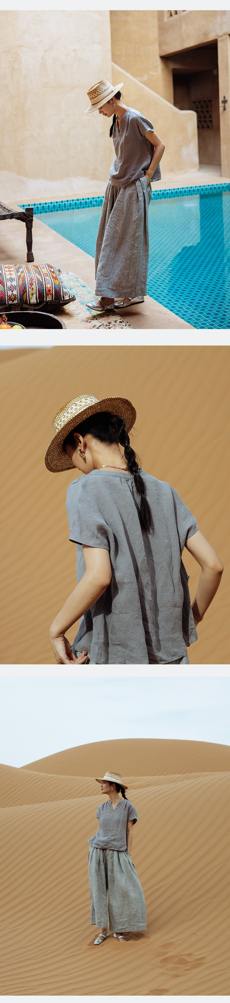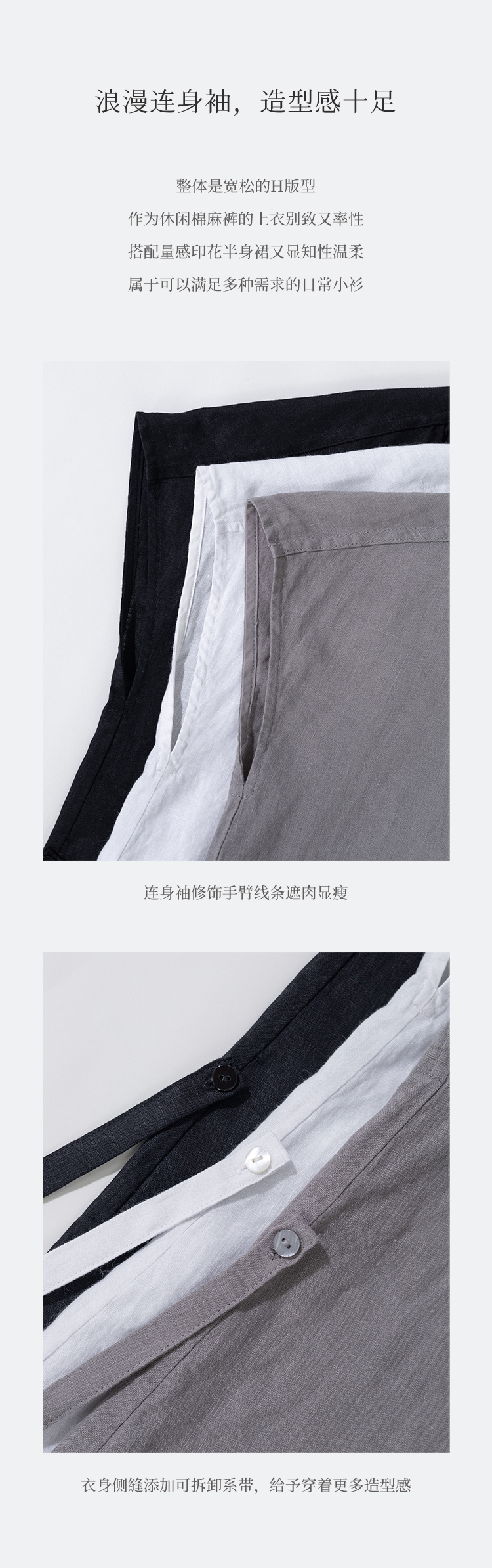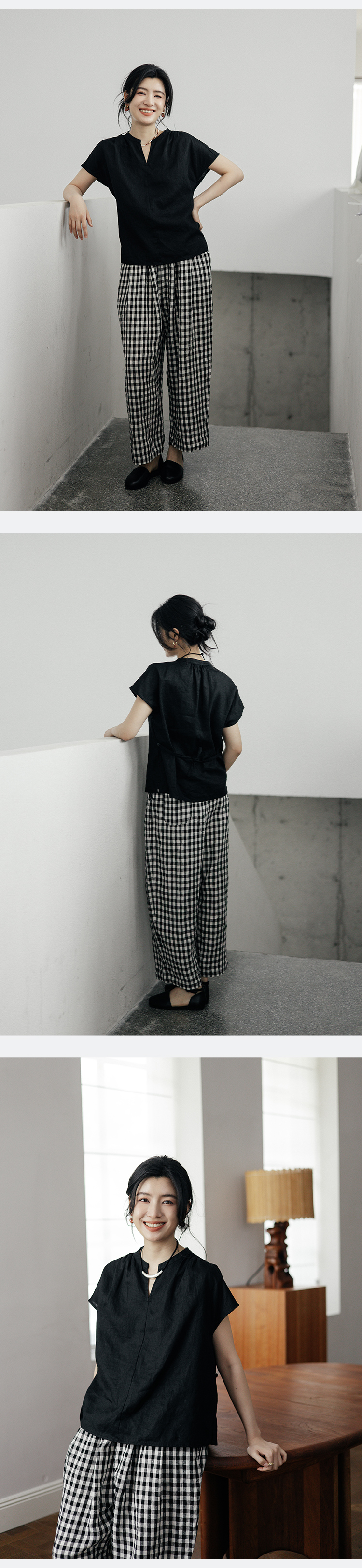 绽放481朵【黑白灰系列·俏佳人】文艺砂洗亚麻T恤小衫V领短袖