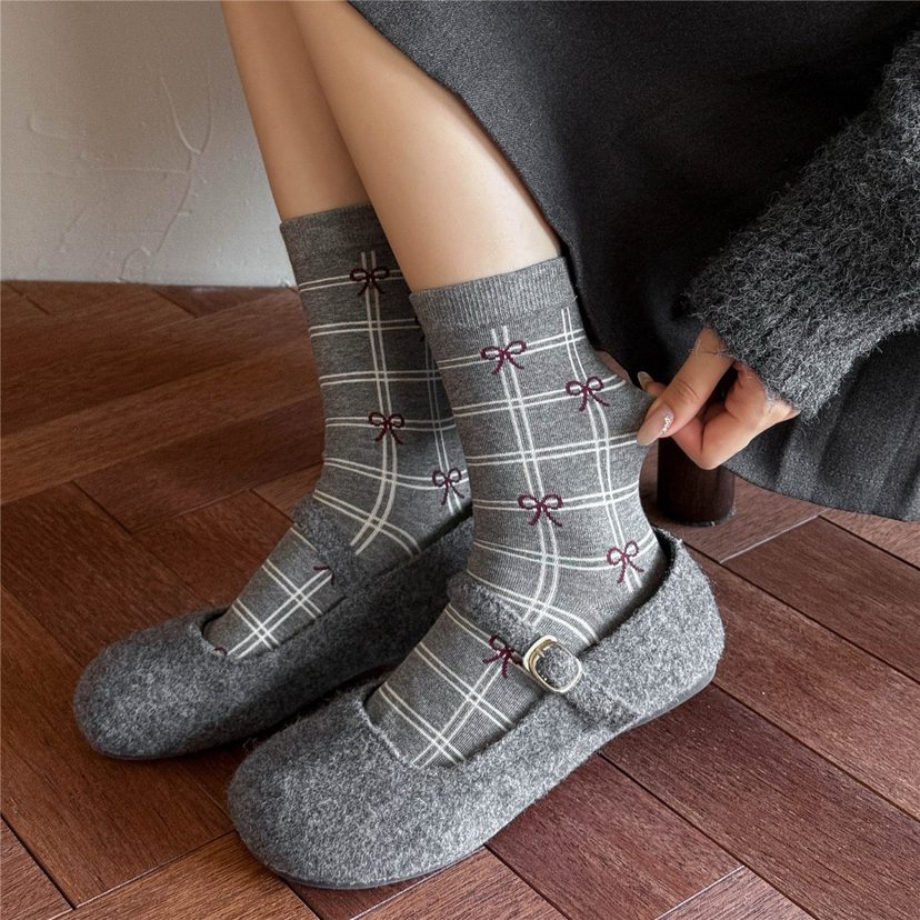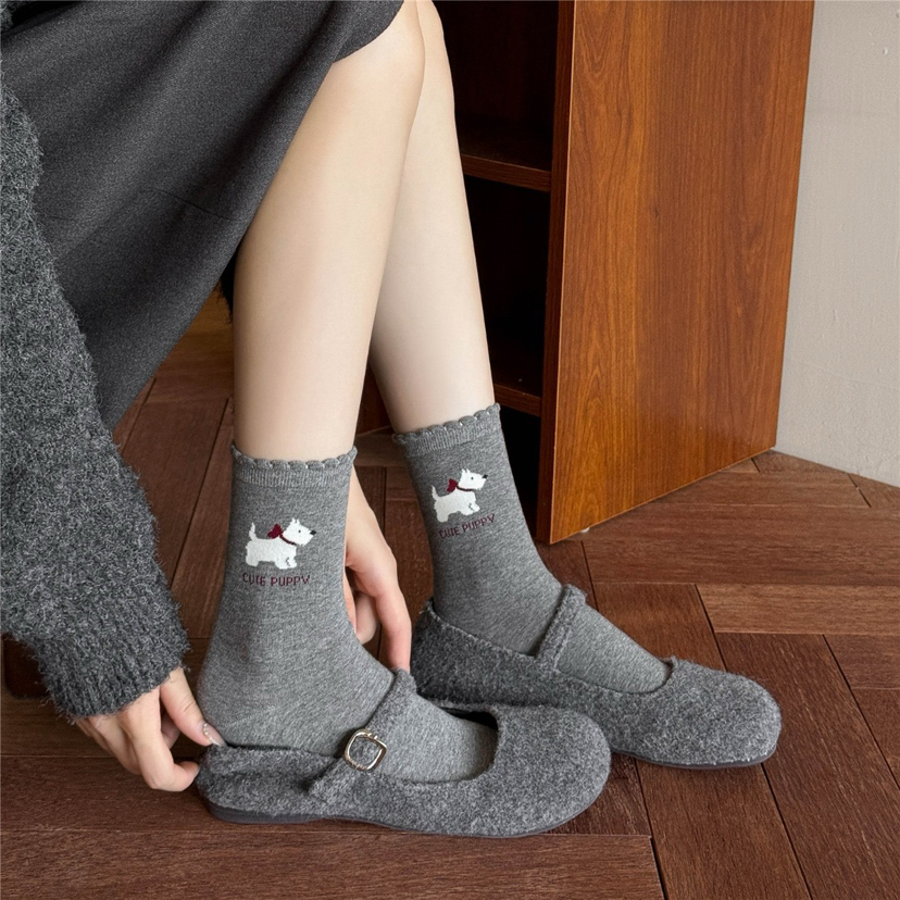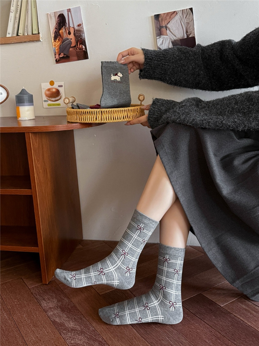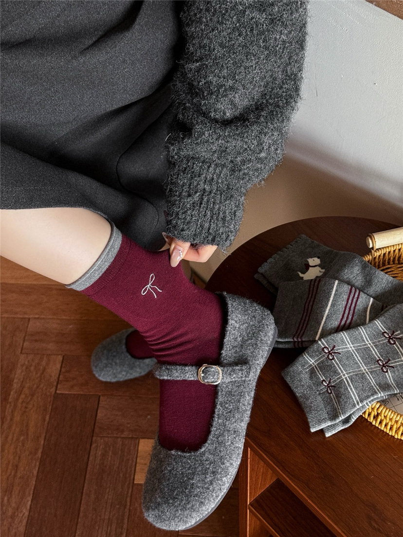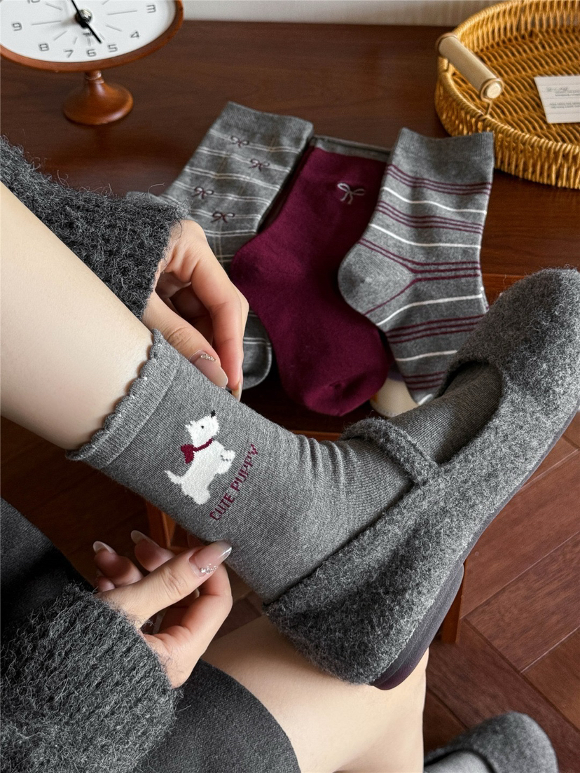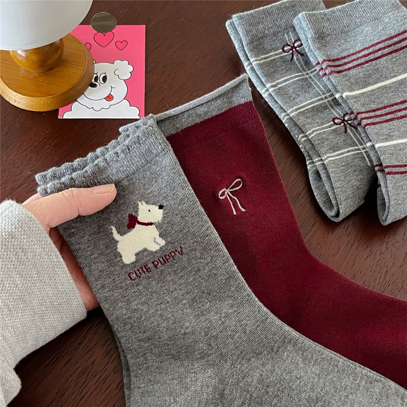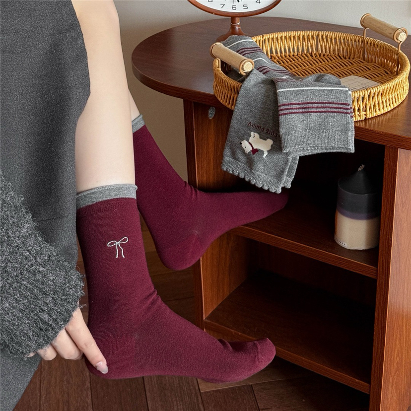 4双一组!2025秋冬女袜格雷灰+安可拉红经典色系搭配 可爱小狗 /Miu系风蝴蝶结 /条纹 中筒袜棉袜