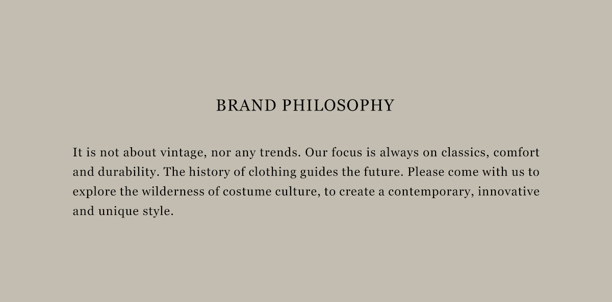 - 不局限于复古,更不会逐流于潮流,我们想挣脱快世界,关注永恒的经典、舒适和耐用,用对物质的极致追求,在荒芜之地饱满我们的内心,缓慢地得到一样东西是一种恩赐,品位从来不是速度与激情的产物。