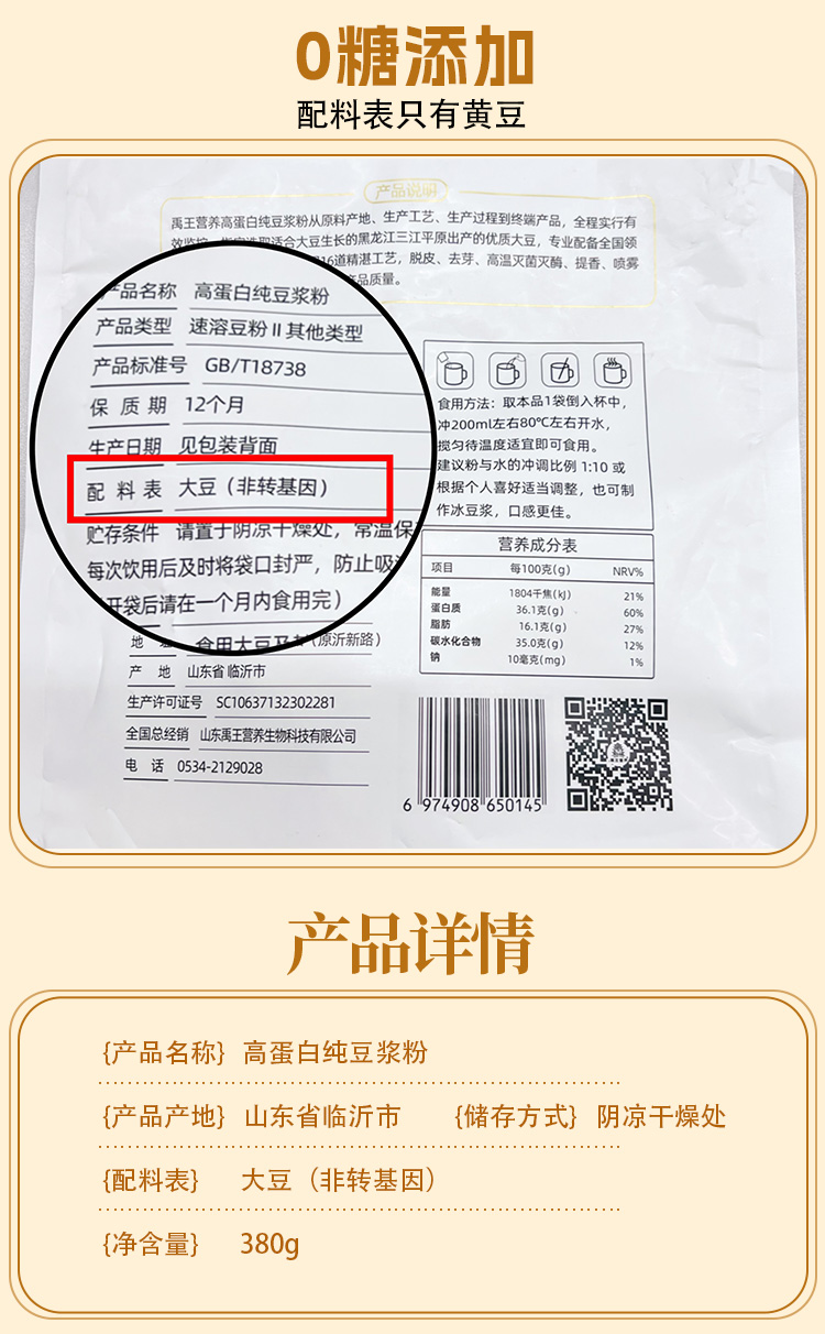 高蛋白纯豆浆粉 0糖添加 原汁原味