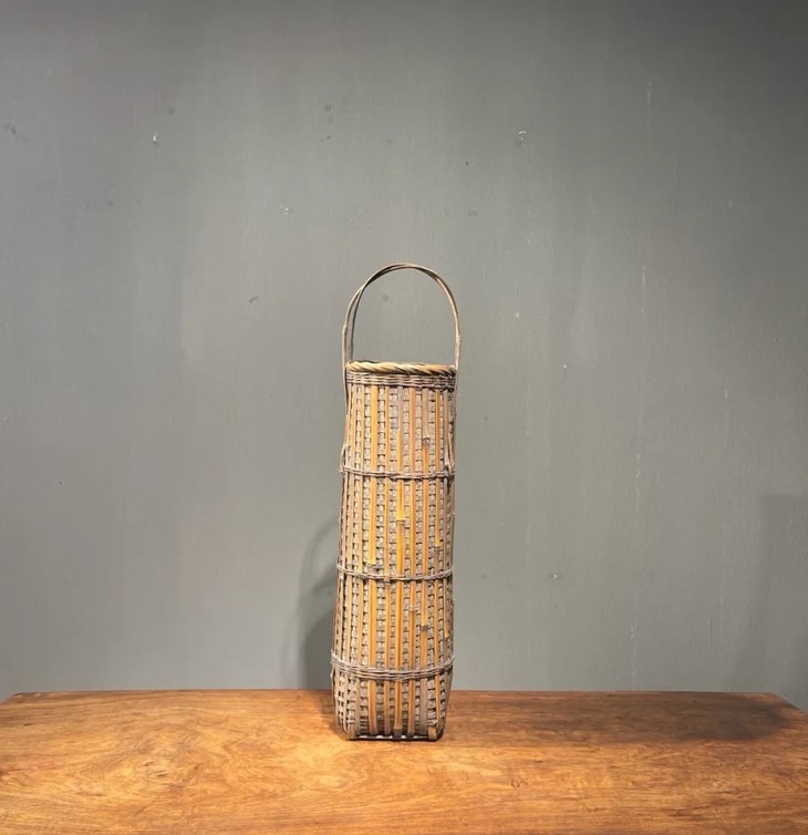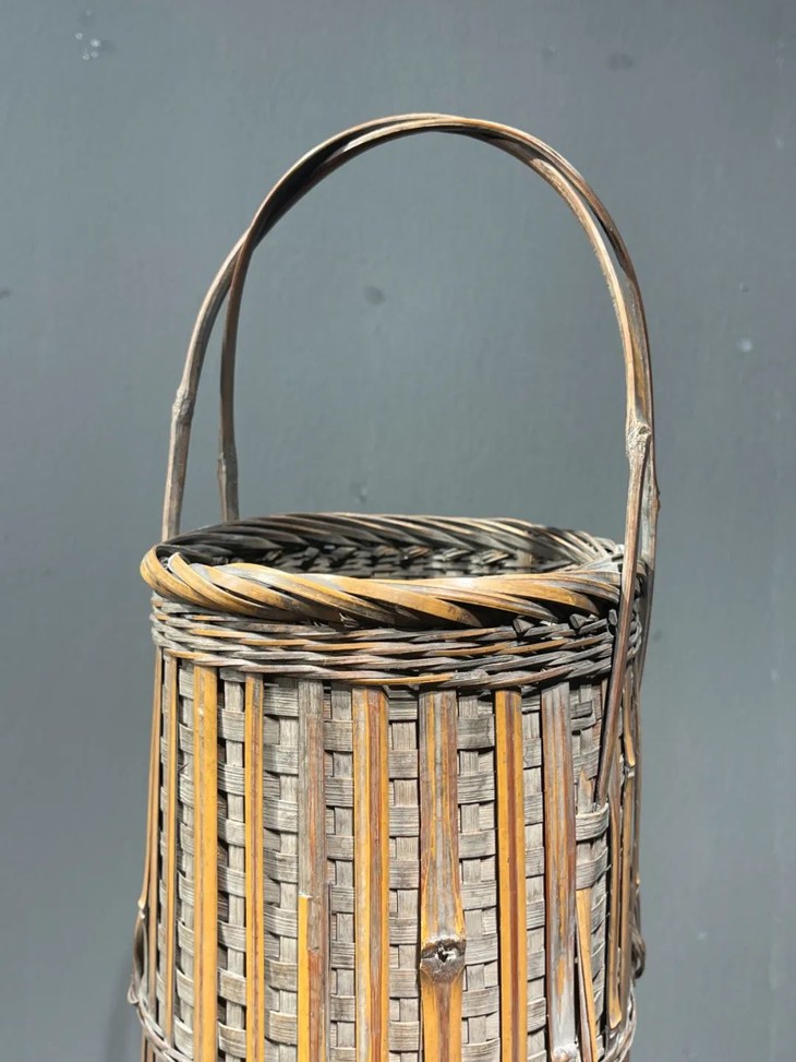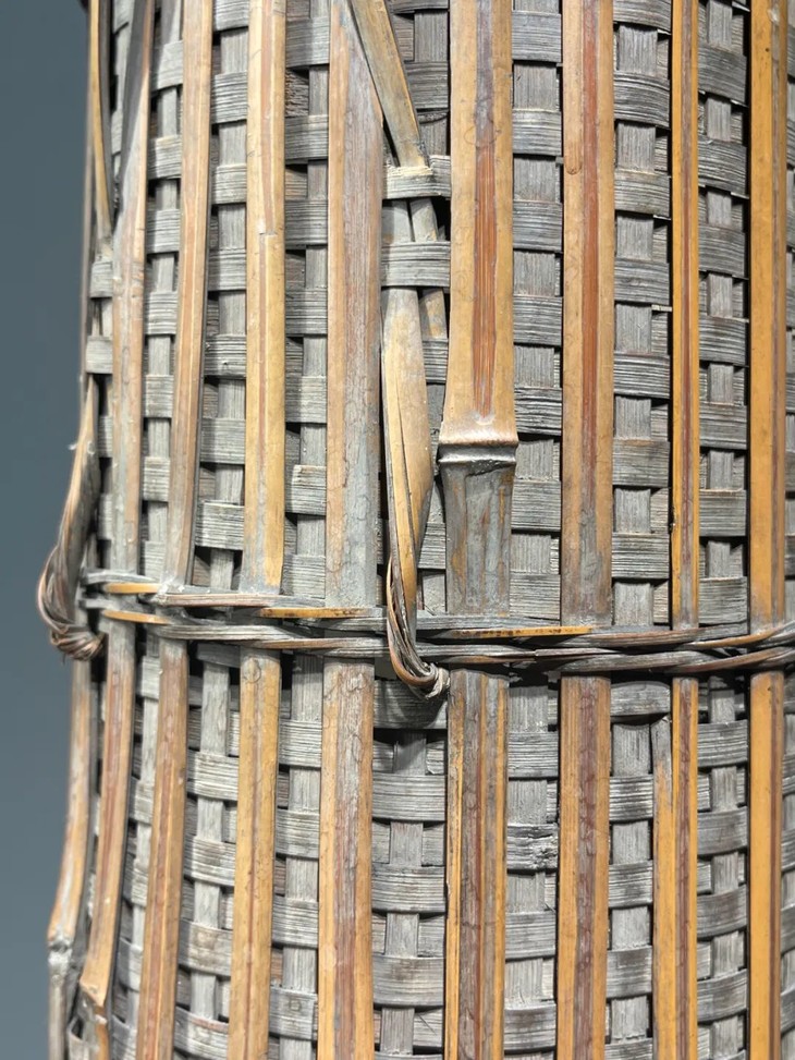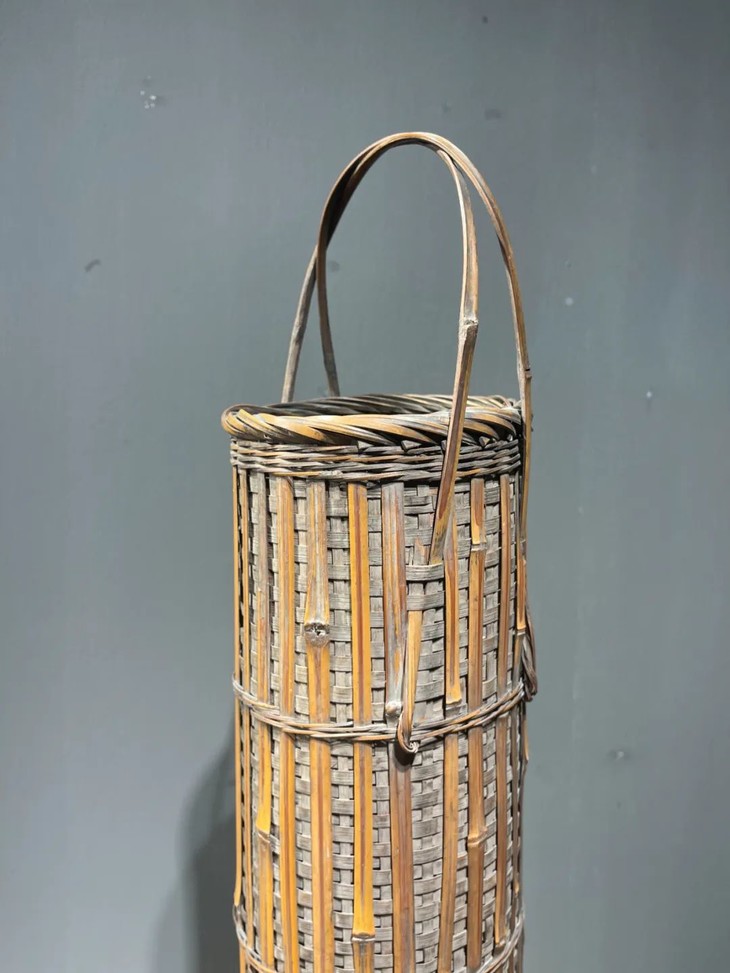 此竹编提梁直筒式花器,除表面自然磨损痕外,基本保存完好,不含篮内盛水花瓶,插花时可以搭配尺寸合适的截段竹筒或是圆筒状玻璃瓶盛水插花。