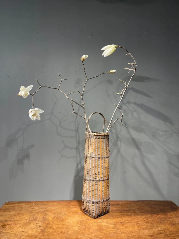 这是一件造型独特典雅,制作精美、年代久远的日本竹编提梁直筒式花器,以珍贵竹条细密编成提梁高圆筒状花篮,设计风格独特精緻,整器完全以传统竹编工艺手作编成,圆筒状器身,老竹器逾百年之包浆皮壳渾厚温润,设计精巧别致,优雅大方,气质非凡,如今可单独摆放于当代空间内,或是插上时令花卉与嫩叶树枝,因其艺术气质、独特风格与优良之细节,可以与各种空间搭配,是转转会女主人珍藏多年的老花器,小编特意整理出历年来女主人以此优雅花器展現出的插花作品。