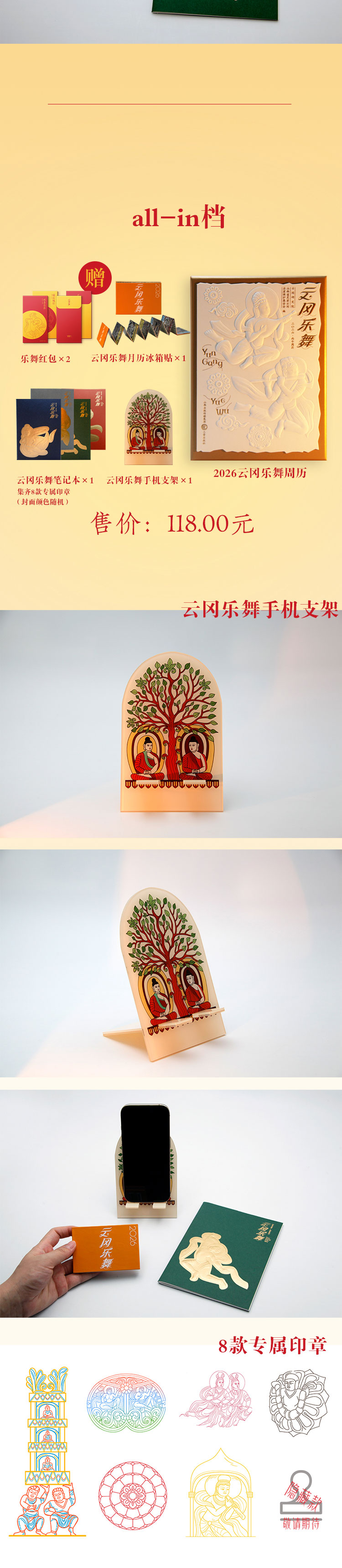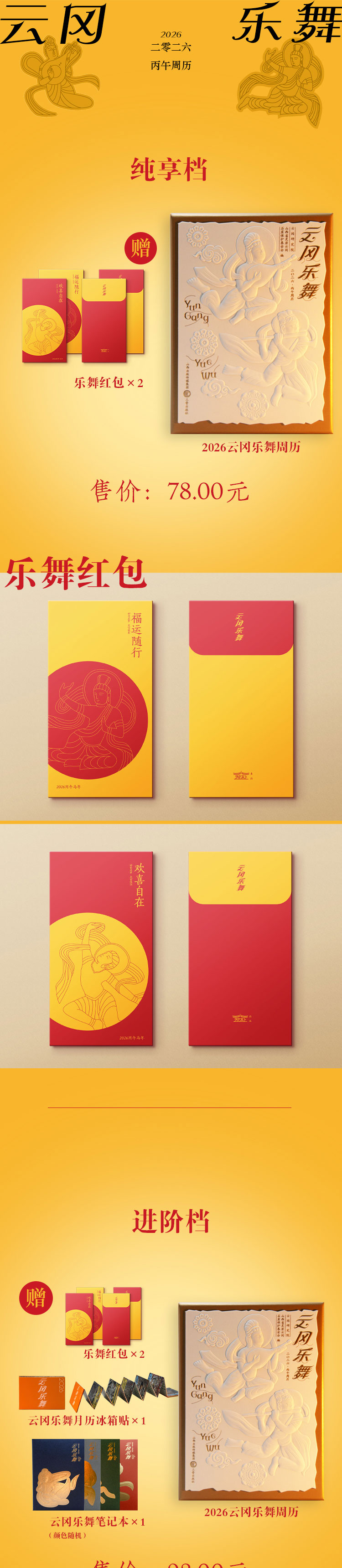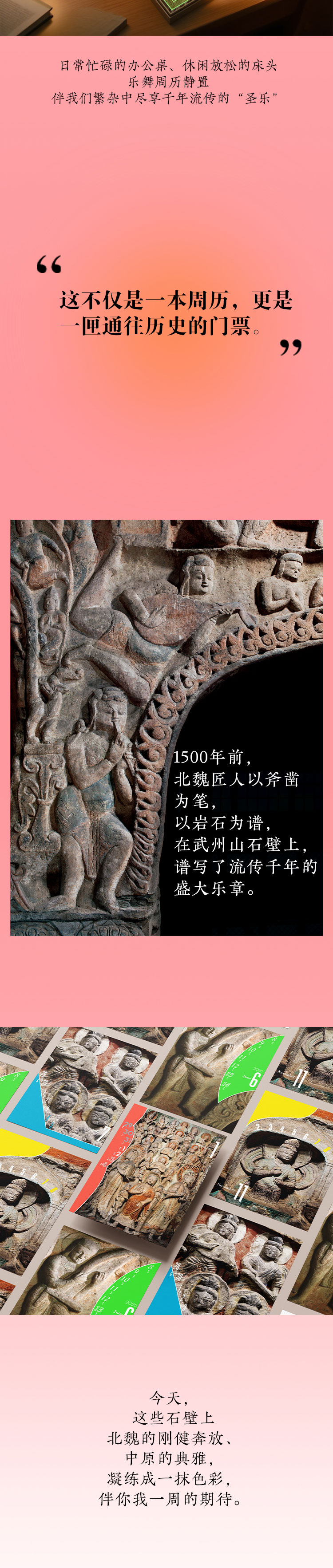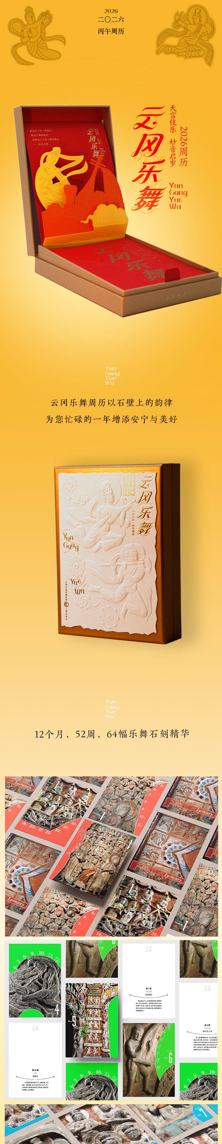 《云冈乐舞》2026周历,由云冈研究院和山西省灵岩云冈石窟保护基金会编写而成,汇聚了云冈造像中最具代表性的64幅(12周+52周)乐舞石刻精华。