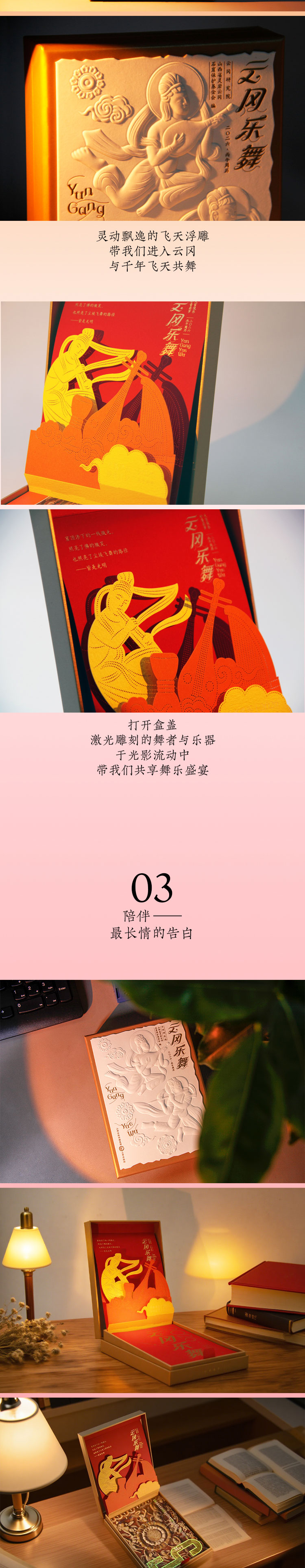 礼盒之上,踏莲起舞、琵琶弹奏的飞天仿佛被瞬间唤醒。开启盒盖,炽烈的立体镂空飞天翩然跃出,琵琶轻倚,箜篌微斜,细腰鼓静待,一场为当代人订制的云冈乐舞缓缓拉开序幕。