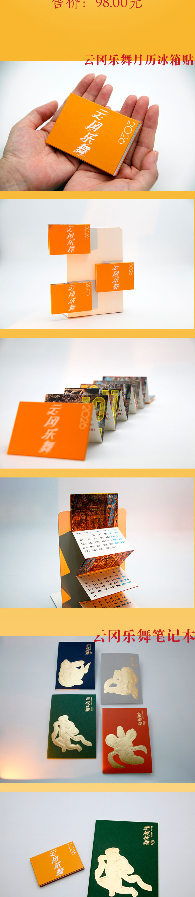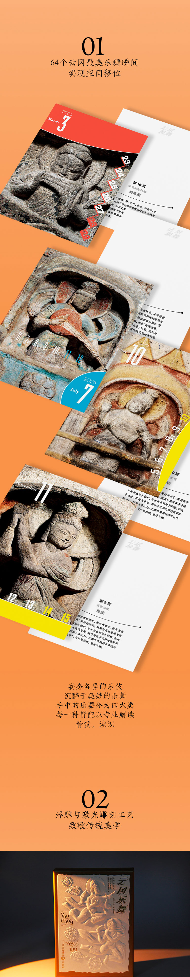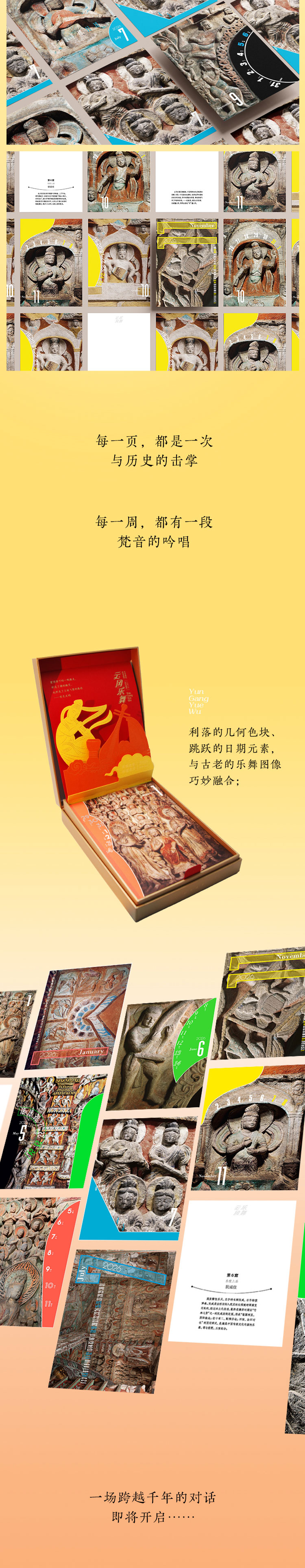 周历封壳采用浮雕工艺,展现云冈代表性乐舞形象,内侧激光雕刻再现飞天动势,艺术感与实用性并存。内页利落的几何色块、跳跃的日期元素,与古老的乐舞图像巧妙融合,时间被完美嵌入到石壁的肌理之中,完成了古今的交汇。