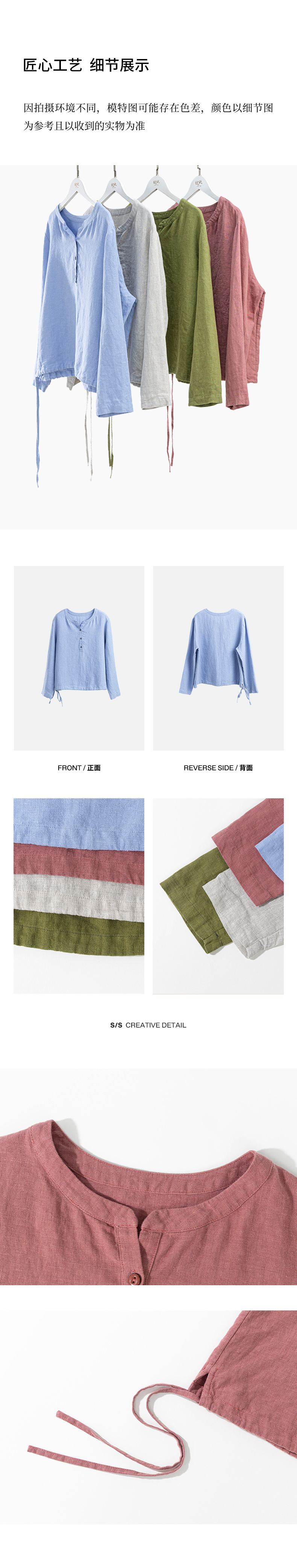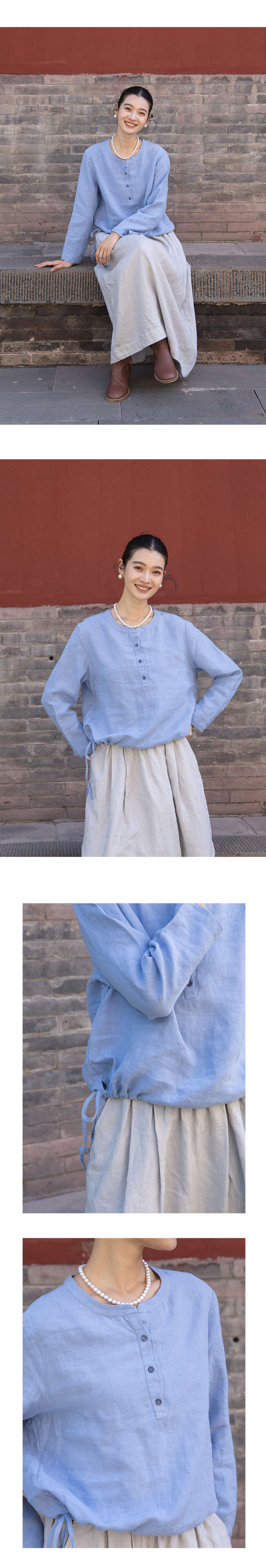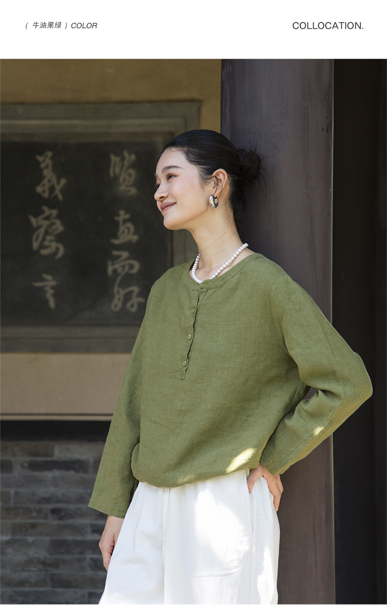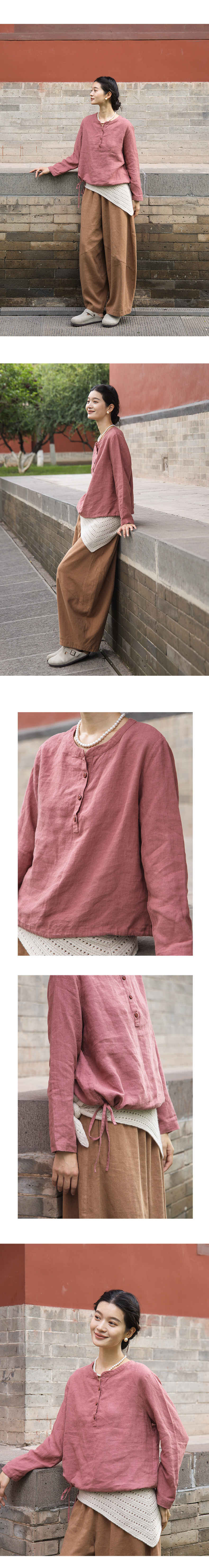 绽放572朵/重磅皱纹亚麻半开襟下摆抽绳设计感圆领长袖衬衫女秋季