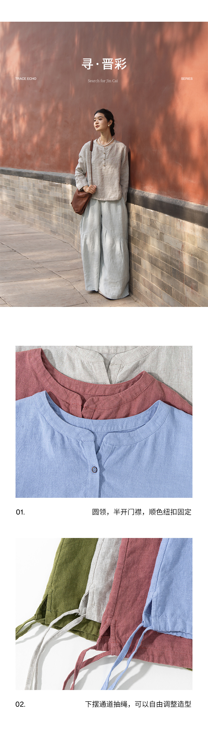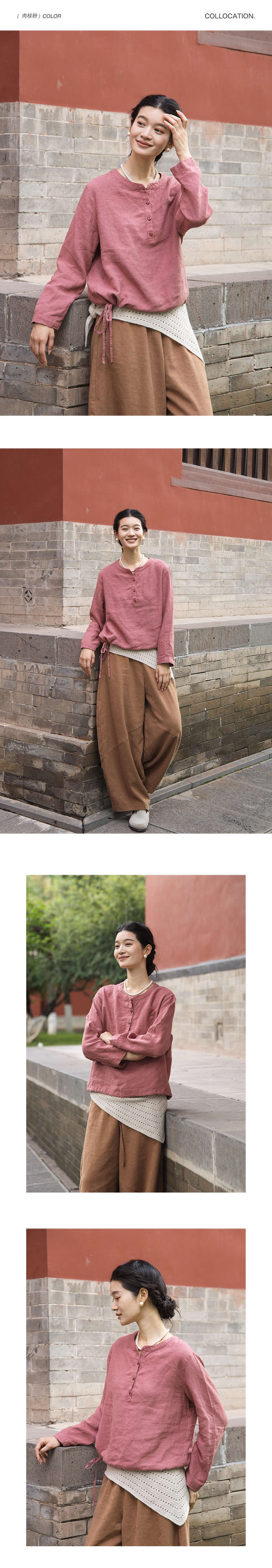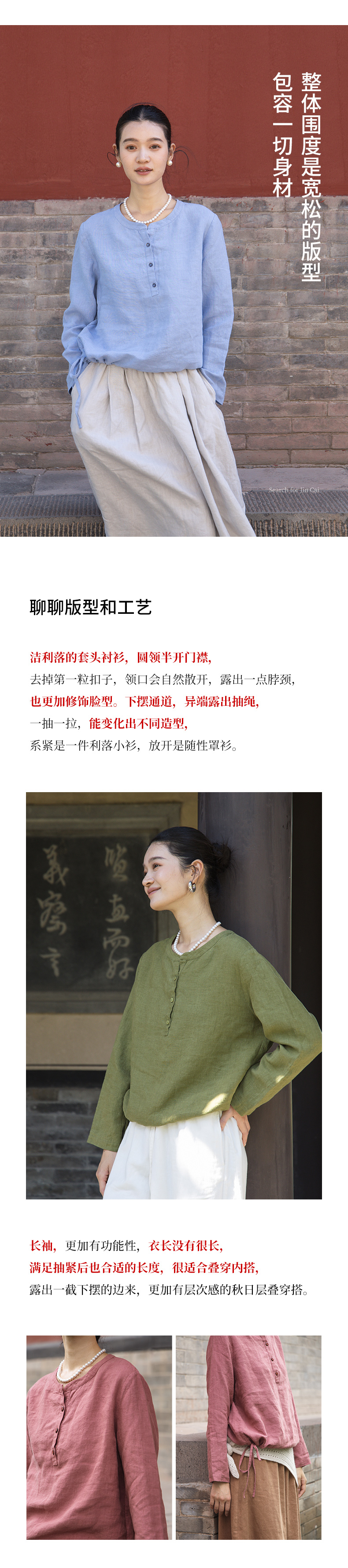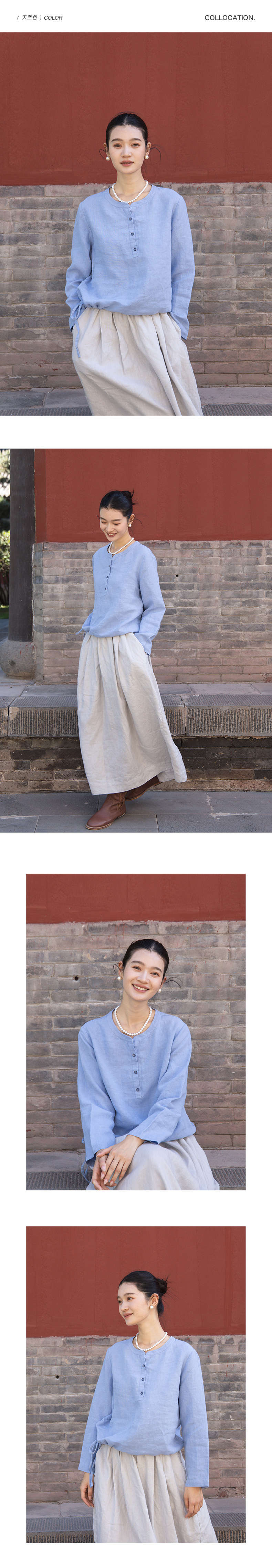 绽放572朵/重磅皱纹亚麻半开襟下摆抽绳设计感圆领长袖衬衫女秋季