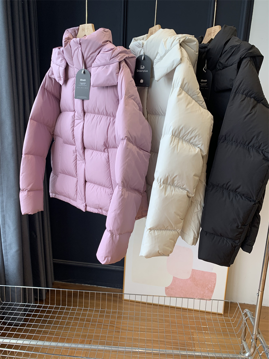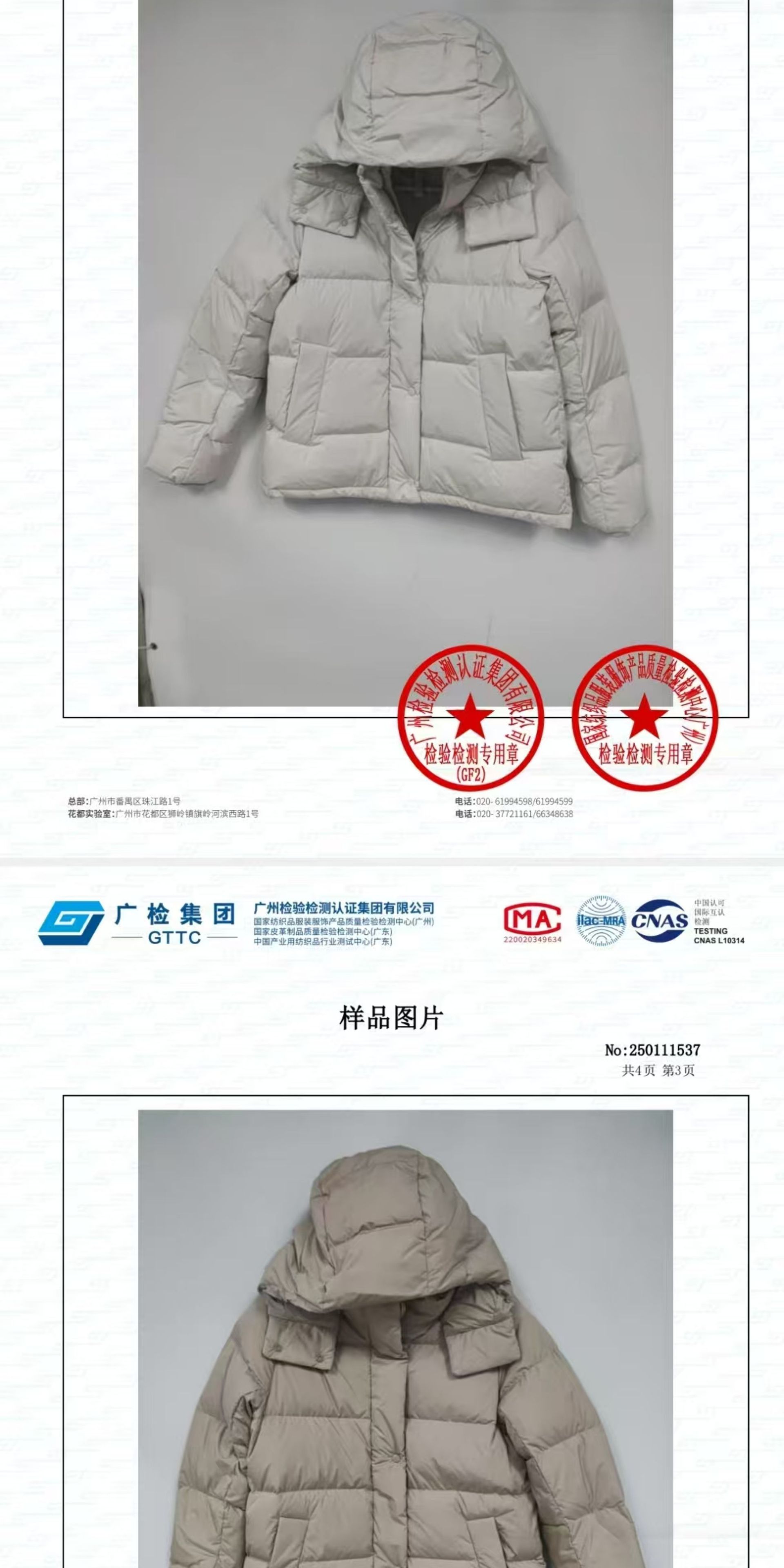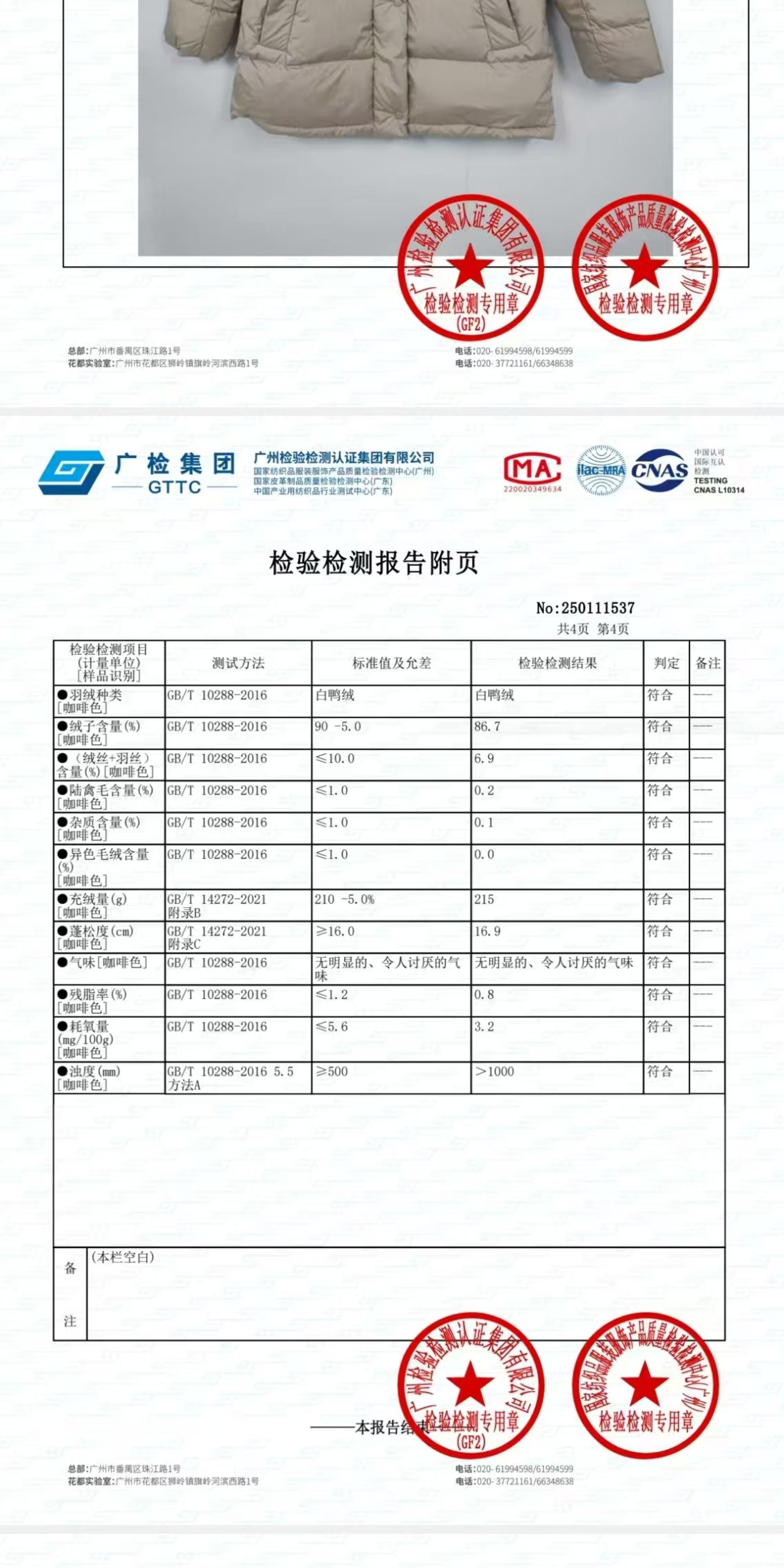 大身、帽子、袖子填充物:绒子含量90%鸭绒