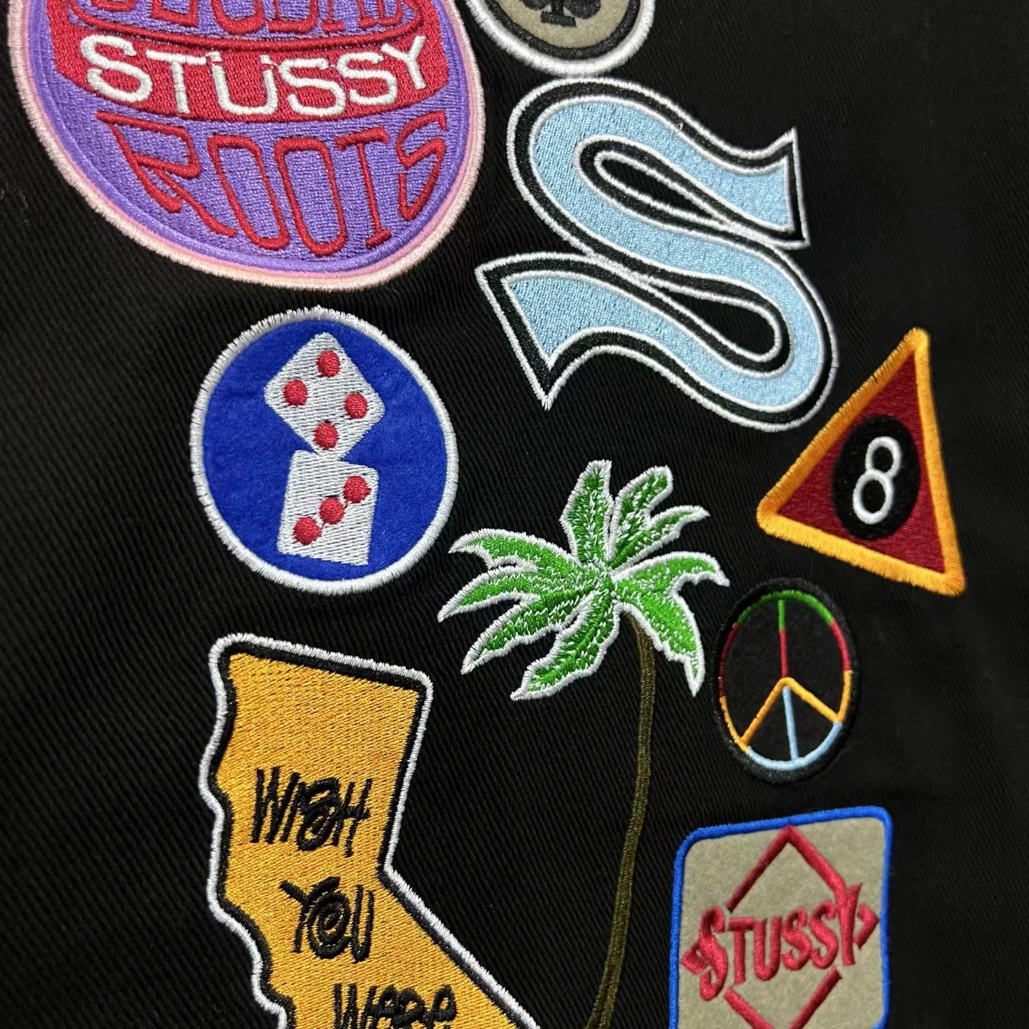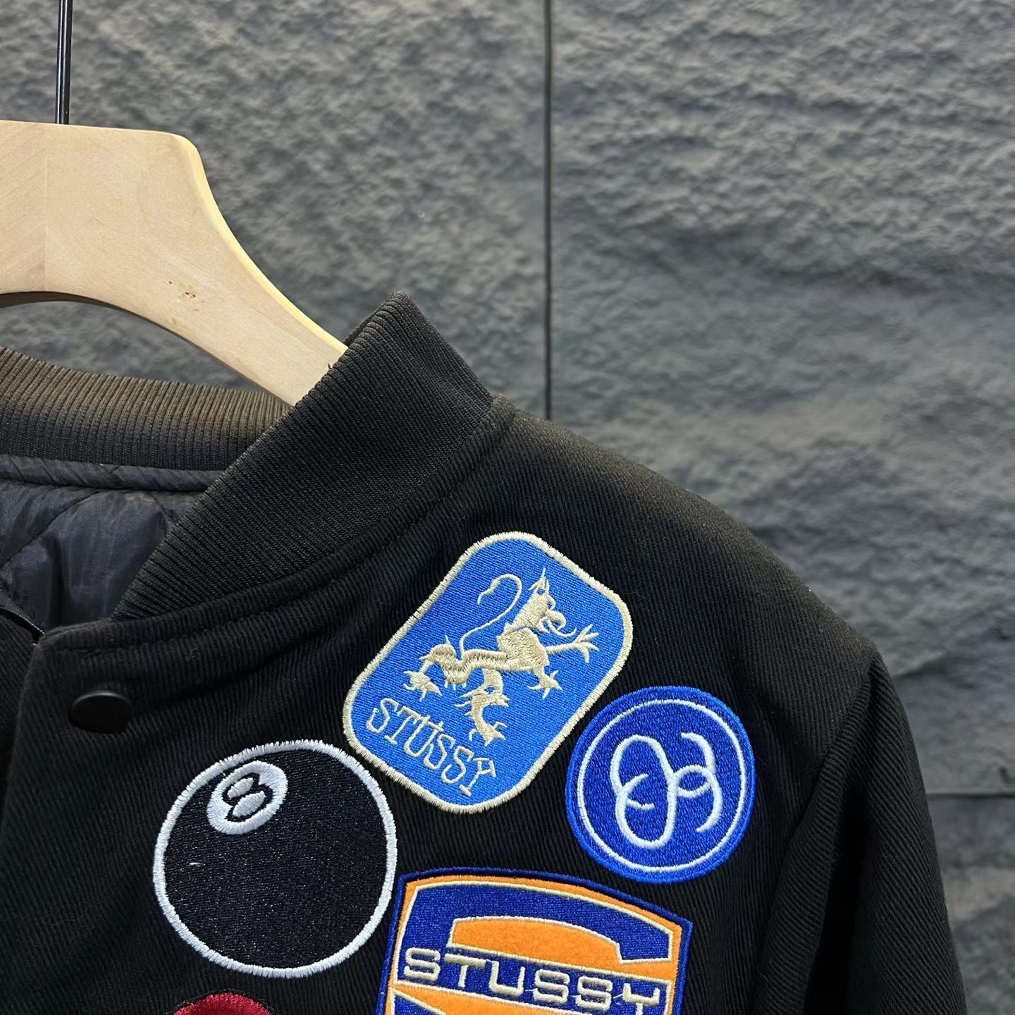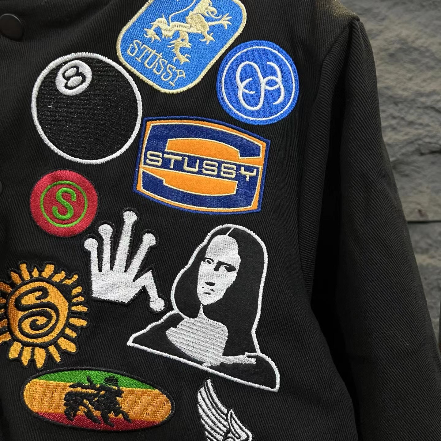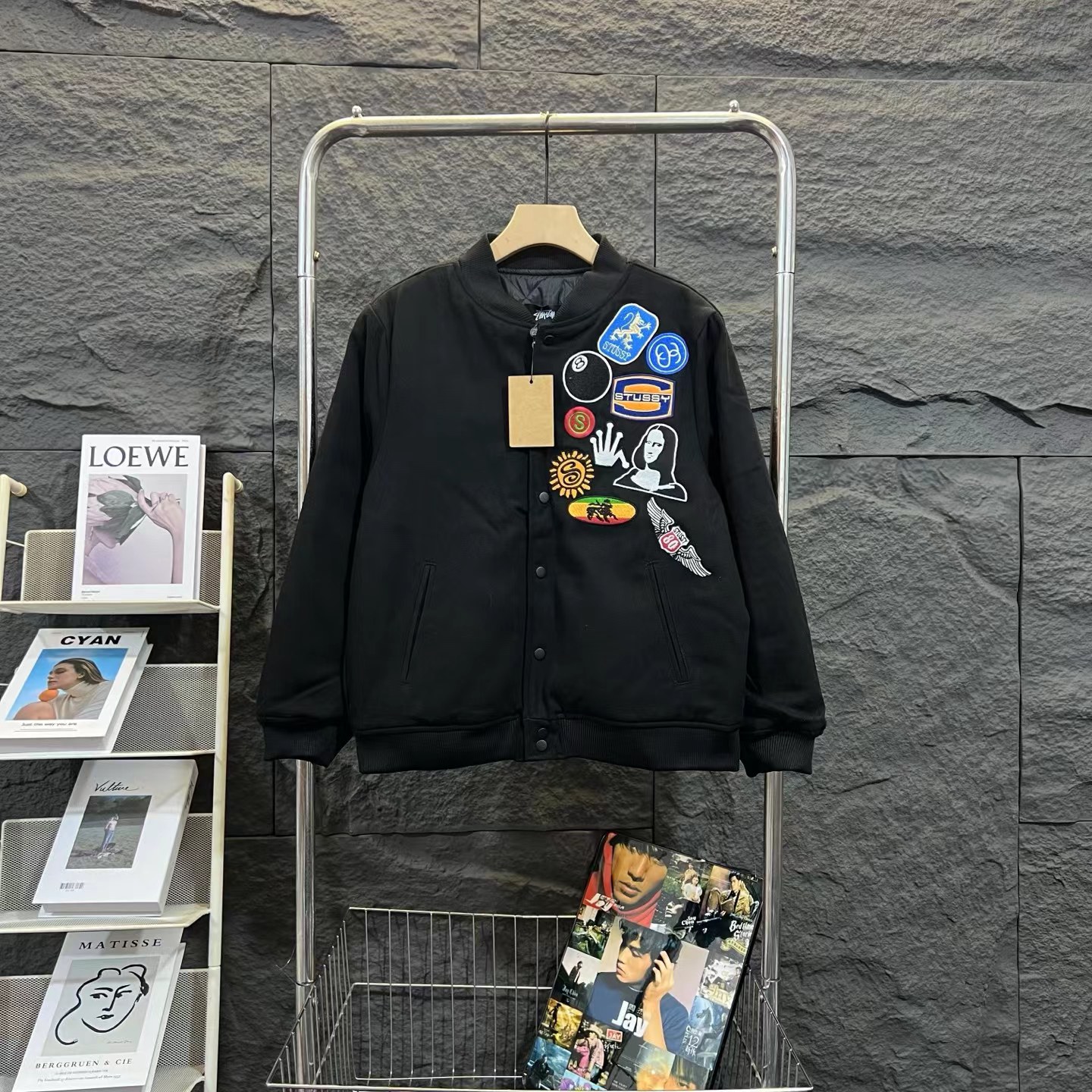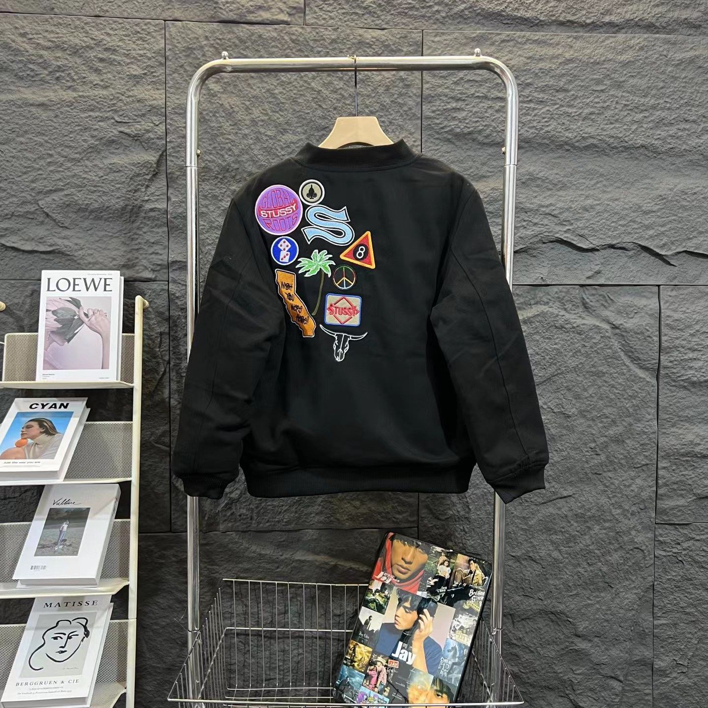 25款徽章贴布刺绣棒球服加棉夹克棉服 新款精典潮流贴图立领棒球服夹克外套,全棉斜纹面的帆布质地结合针织厚实螺纹的棒球服样式 ,符合潮人街头的春秋搭配需求,前后重磅加持的贴布刺绣图案,精细饱满厚实的每一个贴布都堪比一件艺术品,形状各异的造型灵感启发来自不同时期的文化体现,有耳熟能详的黑八桌球,卡通的皇冠,专属书写体的文字,骰子,椰树等等二十组的作品,每一个刺绣设计都很酷,分布于衣服的左侧胸前和后背,如此个性鲜明的色彩与设计,必定成为时尚先锋和潮流达人狂热追求的单品 可搭配情侣款
